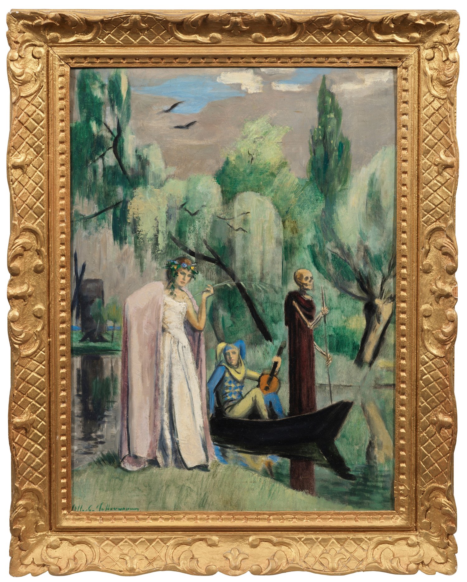 In lockerer, teils schemenhafter Manier gemaltes Werk, in dem sich die Protagonisten kontrastreich von dem in hellen Grüntönen gehaltenen Hintergrund abheben: Während Ophelia beinahe geistesabwesend einen Zweig in ihren Händen betrachtet, gleitet lautlos eine Gondel mit einem Harlekin an Bord und einem Skelett als Fährmann an ihr vorbei. Die Szene stellt eine moderne Interpretation der tragischen Figur der Ophelia aus Wilhelm Shakespeares berühmten Werk "Hamlet" dar, einer jungen, dänischen Adeligen, die sich unglücklich in den Protagonisten Hamlet verliebt, aber nach dem Tod ihres Vaters dem Wahnsinn verfällt und schließlich ertrinkt. Stellt der Fuhrmann im vorliegenden Gemälde augenscheinlich den nahenden Tod der unglücklichen Heldin dar, kann der Gitarre spielende Harlekin als Personifikation des Wahnsinns interpretiert werden. Stiltypisches Werk des Hamburger Künstlers, der auf Anraten Alfred Lichtwarks seine künstlerische Grundausbildung bei Arthur Siebelist erhielt und sich anschließend zwischen 1907 und 1914 in Paris weiterbildete. Er studierte dort an der Académie Matisse und zählte zum Künstlerkreis des Café du Dôme. Inspiriert durch die Pariser Moderne, im Besonderen Pierre-August Renoir und Paul Cézanne entwickelte er seinen eignen Stil. Öl/Lwd., kaschiert auf Karton. L. u. sign.; 60,2 cm x 42,2 cm. Rahmen.