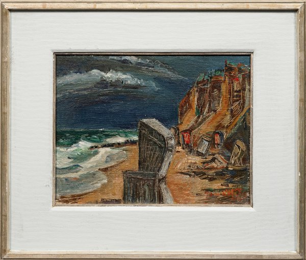 Darstellung im Stil des Expressiven Realismus, wohl Strandmotiv von Sylt. Tom Hops gehörte zu den bedeutendsten Hamburger Künstlern nach 1945 und erhielt 1960 den Edwin-Scharff-Preis, 1974 wurde er zum Professor ernannt. Außer Hamburg selbst waren norddeutsche Landschaften ein Hauptsujet Hops', darunter Sylt. Öl/Lwd.; R. u. sign. u. dat. (19)65. Verso nochmals sign. u. betitelt, Stempel mit Hamburger Künstleradresse. 27,5 cm x 35,5 cm. Rahmen.