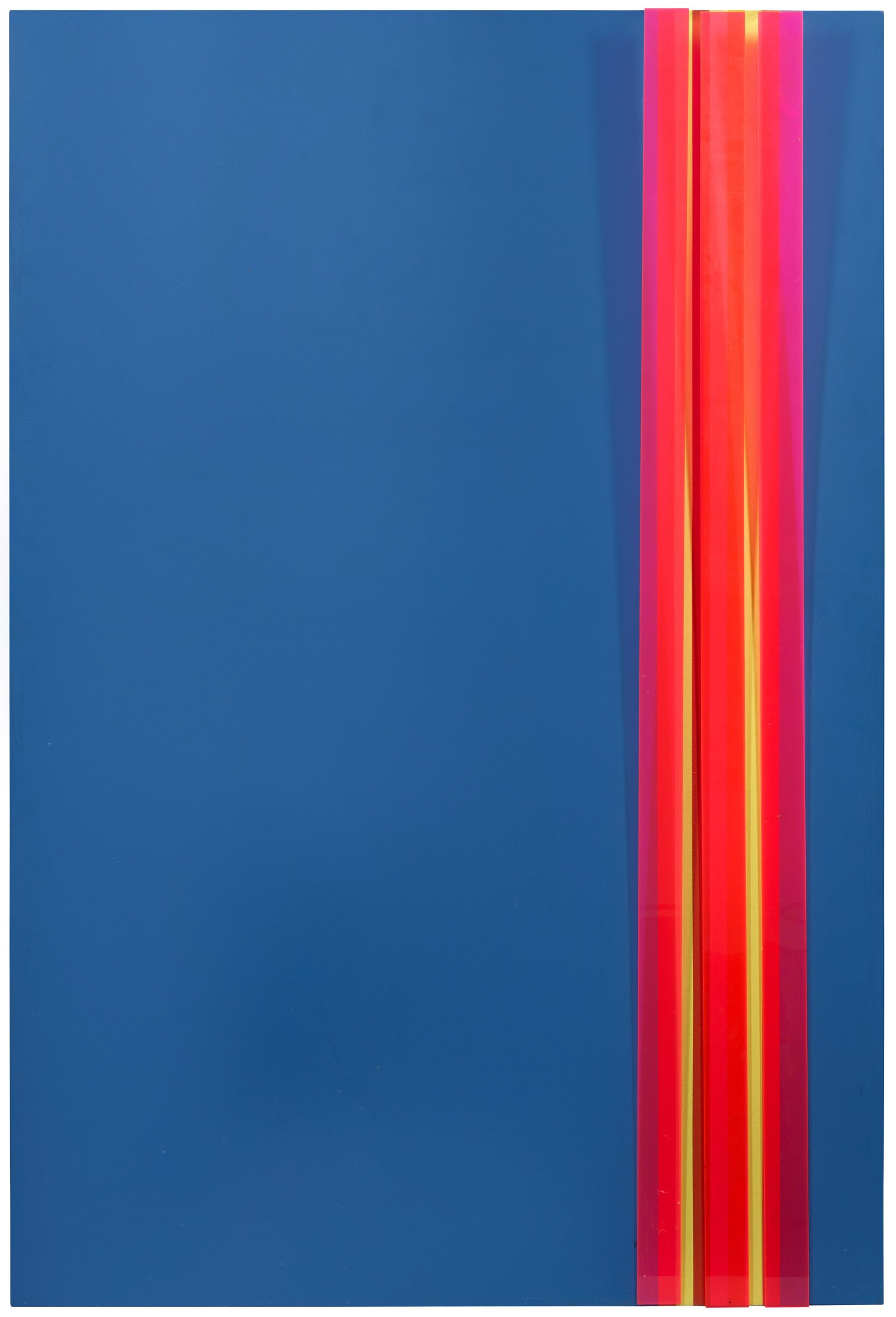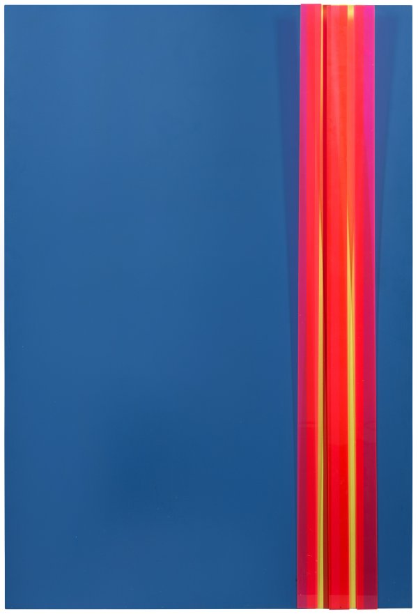 Das collageartige kinetische Werk aus Farbflächen mit vorgehängten, frei schwingenden farbigen Plexiglastreifen gehört zu einer eigenen Werkgruppe im Schaffen des konstruktivistischen Künstlers Rafael Pérez. Pérez studierte an der Kunstakademie Valencia in Venezuela und kam 1966 mit einem Stipendium nach Europa, wo er einige Zeit in Madrid, Paris und Rom lebte, bevor er sich 1967 in der Schweiz niederließ. Nach den neuen Eindrücken dort und insbesondere nach einem Besuch der Biennale in Venedig wandte er sich ganz von der traditionell-gegenständlichen Malerei ab und der modernen abstrakten Kunst zu. Sowohl in Europa wie in Südamerika ist die Arbeit des Konstruktivisten und Vertreters der Konkreten Kunst anerkannt. Acrylfarbe, Plexiglas und Metall/Holzplatte. Verso Atelieretikett mit Werkangaben, Objekt-Nr. 372-72 und Künstlersignatur. 150 cm x 100 cm x 7 cm.
