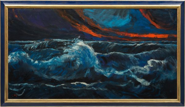 Leuchtend expressiv gemalter Meeressturm mit bedrohlich dunklen Wolken im Abendrot. Verso eine Künstlerreplik nach Kurt Scheeles (1905-1944) Ölgemälde "Blumenform I- Abstraktion Nr. 98" aus dem Jahre 1937, die 2013 im Berliner Kunsthandel angeboten wurde. Lothar Malskat gilt als ein vielseitiger Künstler, der sich in die unterschiedlichsten Malstile hineinarbeiten konnte und beim Publikum sehr erfolgreich ankam. Erst spät wurde er als Fälscher von Kirchenbildern in Lübeck und Moderner Kunst entlarvt, die er im Auftrag gemalt hatte. Öl/Holz. L. u. monogr.; 101 cm x 180 cm. Rahmen.
