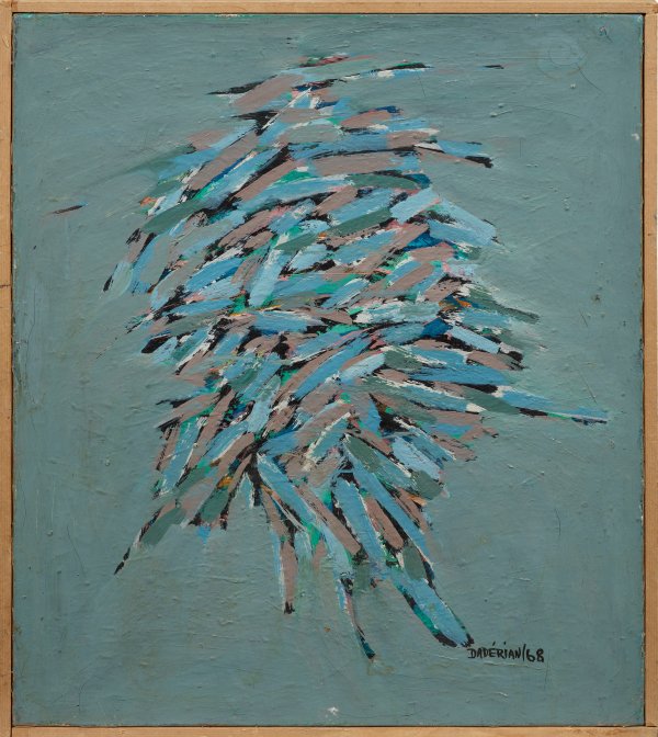 Abstrakte Komposition die von dynamischen, explosionsartig arrangierten Farbstrichen in Grün-Grau-Tönen aufgebrochen wird. Charakteristische, gestisch motivierte Arbeit des libanesischen Künstlers Dikran Daderian - ein Vertreter der Neuen Pariser Schule, einer kosmopolitischen, dynamischen Gruppe von abstrakten Malern, die zwischen 1945 und 1964 in Paris entstand. Daderian ging 1953 nach Paris wo er an der Académie Des Beaux-Arts, der Académie Ranson, der Académie de la Grande Chaumière und der Académie Goetz lernte und Kontakte zu zeitgenössischen Künstlern wie Léon Tutundjian, Camille Bryen, Jean Le Moal und Maria Helena Vieira da Silva schloss. Öl/Lwd.; R. u. sign. und dat. (19)68. Verso nochmals sign., dat. (19)68, betitelt und bez.; 60,8 cm x 49,8 cm. Atelierleiste.
