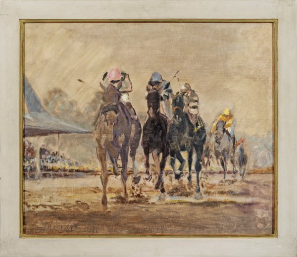 Impressionistisch aufgefasste Darstellung eines Galopprennens, hier dargestellt eine Szene vom legendären Saragota-Rennplatz in den USA, von einem der renommiertesten zeitgenössischen Pferdemaler. Klaus Philipp, ursprünglich im Polizeidienst, zuletzt als Leiter der berittenen Polizei in Stuttgart, hatte er schon Ende der 1950er Jahre in Stuttgart zusätzlich Malerei studiert und sich nebenher der Pferdemalerei gewidmet. 1980 schied er aus dem Polizeidienst aus und wandte sich ganz der Kunst zu. Er porträtierte zahlreiche berühmte Pferde und ihre Reiter, vielfach im Auftrag internationaler Pferdeliebhaber, und dokumentierte Pferderennen im Sinne der Reportagemalerei. L. u. sign. u. dat. 1986. Öl/Lwd./Hartfaser. 64 cm x 75 cm. Rahmen.