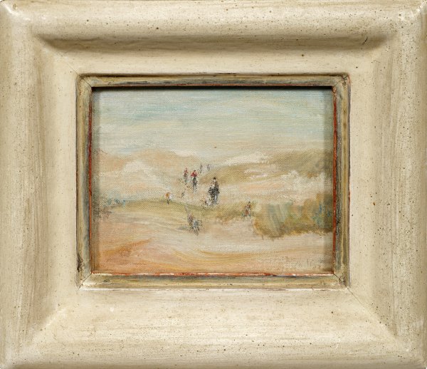 Impressionistisch aufgefasste Darstellung. Klaus Philipp, der als einer der besten zeitgenössischen Pferdemaler gilt, befasste sich seit seiner Jugend mit Pferden. Schon neben seiner Tätigkeit als Polizeireiter und Leiter der berittenen Polizei in Stuttgart widmete er sich der Pferdemalerei. 1980 schied er aus dem Polizeidienst aus und wandte sich ganz seiner Passion zu. Hierbei stellte er zahlreiche legendäre Pferde und ihre Reiter dar, teilw. im Auftrag ihrer vermögenden, prominenten, internationalen Besitzer und stellte vielfach aus. Mischtechnik mit Wachskreide und Ölpastell/Lwd. Verso auf dem Rückseitenschutz sign., betitelt u. dat. 1981. Sichtmaß 8,4 cm x 10,4 cm. Rahmen.