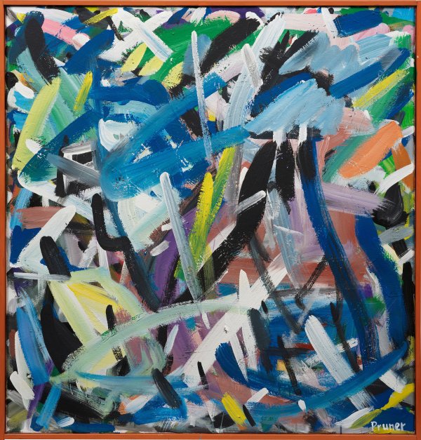 Abstrakte Komposition aus äußerst dynamischen, kraftvollen, engmaschig übereinander gesetzten Pinselstrichen in Blau, Schwarz und Weiß über Gelb, Grün und Rot- bzw. Rosatönen. Charakteristisches, gestisch-informell angelegtes Werk Pruners, der seine Arbeiten als stetiges Experiment zwischen Gegenständlichkeit und Abstraktion versteht. Seit 1978 als freischaffender Künstler tätig, unternahm er Studienreisen u. a. nach Südfrankreich, Italien und Kreta. Seine Werke werden in zahlreichen Ausstellungen wie im Haus der Kunst in München und dem Grand Palais in Paris gezeigt. Dispersionsfarbe/Lwd.; R. u. sign.; 95,5 cm x 85,5 cm. Rahmen.