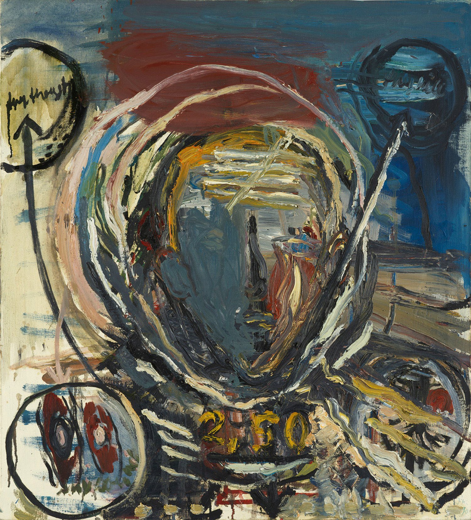 In furiosem und teils stark pastosem Pinselstrich gemaltes Werk, in dessen Mittelpunkt ein Gesicht erscheint, das mit seiner Umgebung verwoben scheint. Expressive, abstrahierte Arbeit aus dem Frühwerk Kahrs. Die Arbeit entstand während seiner Studienzeit an der Hochschule der Künste in Berlin, die der Künstler von 1988-1994 besuchte und als Meisterschüler von Walter Stöhrer abschloss. Seine Werke wurden ab Mitte der 1990er Jahre auf zahlreichen Einzel- und Gruppenausstellungen u. a. im Stedelijk Museum voor Actuele Kunst (S.M.A.K.) in Gent (2001), im P.S. 1 Contemporary Art Center in New York (1997, 1999), auf der ersten Berlin Biennale (1998) und in der Tretjakow-Galerie in Moskau gezeigt. Öl/Lwd.; R. u. monogr. und dat. (19)90. Verso mit Widmung, dat. 11.10.92 und sign.; 78,5 cm x 71 cm.