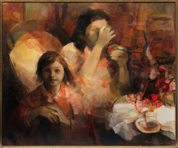 Darstellung einer Frühstücksszene mit Mutter und Tochter, gemalt mit der für den Künstler typischen Tendenz zur expressiven Formauflösung und starken Betonung der roten Farbpalette. Kosovanyi gelangte nach verschiedenen Berufsausübungen über Umwegen zur Malerei. 1971-1979 studierte er in Bratislava Porträt- und Landschaftsmalerei, danach unterrichtete er zunächst an einer Schule. Obwohl er sich schon seit Ende der 1970er Jahre an Ausstellungen beteiligte, begab er sich erst 1984 in die Existenz als freischaffender Künstler. Sein Kunstverständnis speist sich aus der Klassischen Moderne. Öl/Lwd.; R. u. sign. u. dat (19)86; Verso sign., betitelt, dat. u. mit Galeriestempel versehen. 110 cm x 110 cm. Rahmen.