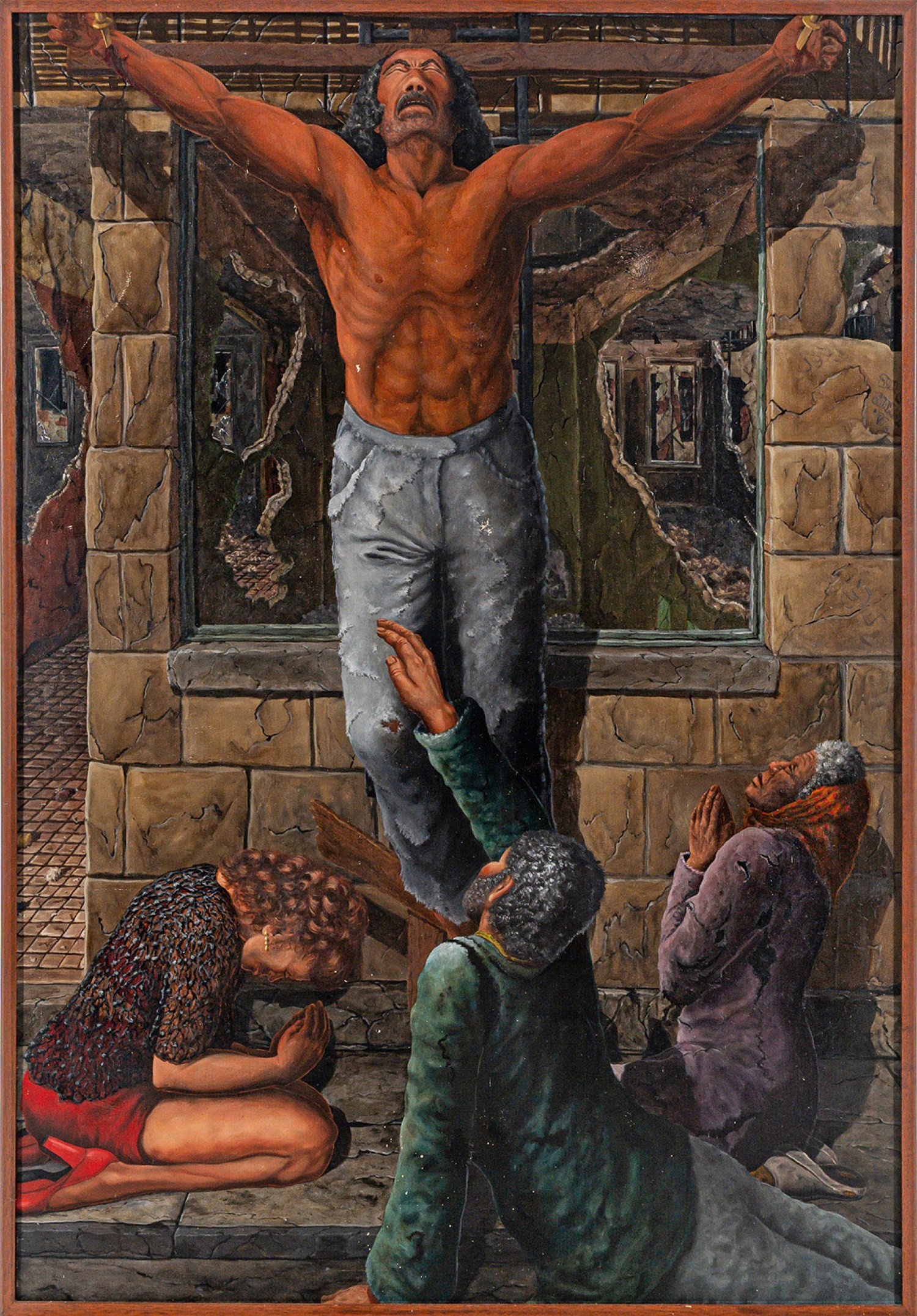 Die Darstellung zeigt einen Afroamerikaner mit freiem Oberkörper in zerschlissenen, alten Jeans, wie dieser in einem heruntergekommenen New Yorker Stadtviertel gekreuzigt wurde; zu seinen Füßen die trauernde Mutter als moderne Muttergottes und ein junger, vollbärtiger, gleichfalls dunkelhäutiger Mann als zeitgenössische Verkörperung des Apostels Johannes, außerdem eine junge, knapp bekleidete, weiße, betende Frau in rotem Minirock, roten Schuhen, rotem BH und Netz-Shirt als heutige Maria Magdalena. Das Gemälde des Phantastischen Realismus aus dem Jahr 1977 ist ein Beispiel für eine andere Sicht auf Jesus Christus und eine bis heute gültige Kritik an der White Supremacy und dem Rassismus in den USA. Stanton studierte 1967-1974 Malerei in New York, 1975 hatte sie ihre erste Einzelausstellung. Öl/Lwd.; Am rechten Bildrand sign. u. dat. (19)77. Verso Widmnung der Künstlerin, dat. (19)82. 183 cm x 127 cm. Rahmen.