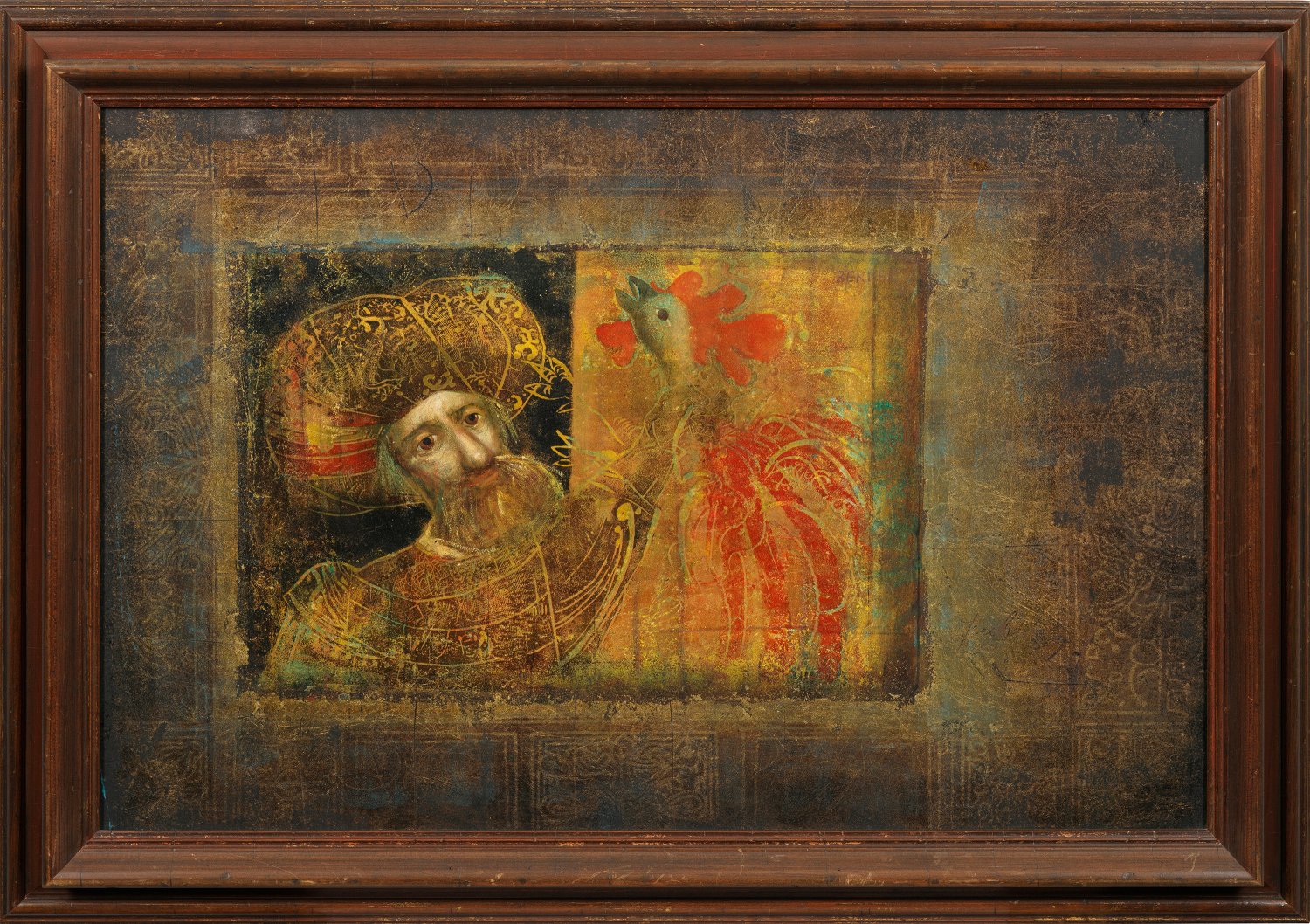 Ausschnitthaft komponierte Schilderung eines Orientalen mit ausladendem Turban und einem Hahn, umgeben von einer reich ornamentierten, Tapeten-ähnlichen Gestaltung. Berber, der an der Akademie in Ljubljana studierte und 1978-1982 an der Akademie in Sarajevo lehrte, zeigt hier ein treffliches Beispiel seiner charakteristischen Kombinationstechnik, in der er verschiedene Malmittel und Materialien verbindet und mit Blattgold bereichert, was den Arbeiten etwas Ikonenhaftes verleiht. Mischtechnik mit Öl und Blattgold/Papier. R. ob. sign.; 51 cm x 74 cm (Sichtmaß). Rahmen.