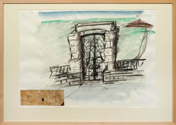 Mit kraftvollem Duktus 1999 geschaffenes Blatt, in reduzierter, expressiver Formensprache und Farbpalette ein Eisentor darstellend. Unten links ein Fotoausschnitt einer Sandsteinwand mit Messingplakette. Lüpertz zählt zu den bedeutendsten deutschen Künstlern der Gegenwart und gehört neben Baselitz, Immendorff und Penck zu den wichtigsten Repräsentanten des Neoexpressionismus, aus dem um 1980 die sog. "Neuen Wilden" hervorgingen. Collage, Kohl und Gouache/Papier. R. u. sign.; Verso Galerieetikett. Blatt 56 x 80 cm. Rahmen.
