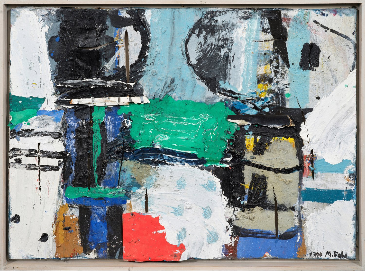 Äußerst kraftvoll und pastos wird die Farbe auf einen collagierten und teils eingeschnittenen Untergrund aufgetragen und überlagert somit die ursprüngliche Oberflächentextur der collagierten Materialien und verbindet diese zu einem Farbraum. Der Künstler rückt die Farbe klar in den Fokus seiner Arbeit und bricht gleichzeitig die Grenzen zwischen Plastik und Malerei auf. Menno Fahl studierte 1988-1992 Malerei an der Muthesius Kunsthochschule Kiel bei Peter Nagel und anschließend Bildhauerei an der Universität der Künste Berlin bei Lothar Fischer. Collage und Öl/Lwd.; R. u. dat. 2000 und sign.; 60 cm x 80,5 cm. Atelierleiste.