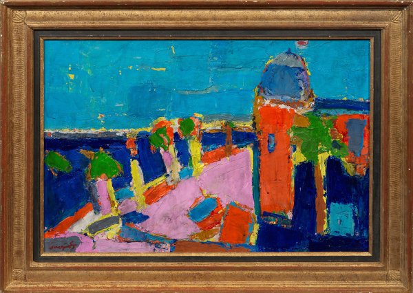 In greller, leuchtender Farbigkeit und äußerst pastosem und kraftvollem Duktus gemalte Impression des berühmten Luxushotels Negresco an der Uferpromenade des Anglais in Nizza. Der Name des Hotels, das im Stil der Belle Époque errichtet wurde, geht auf den rumänischen Erbauer Henri Negresco (1868-1920) zurück, und beruht auf Entwürfen des Architekten Édouard Niermans (1859-1828). Öl/Lwd.; L. u. sign. sowie verso nochmals sign. und betitelt. 46 cm x 65 cm. Rahmen.