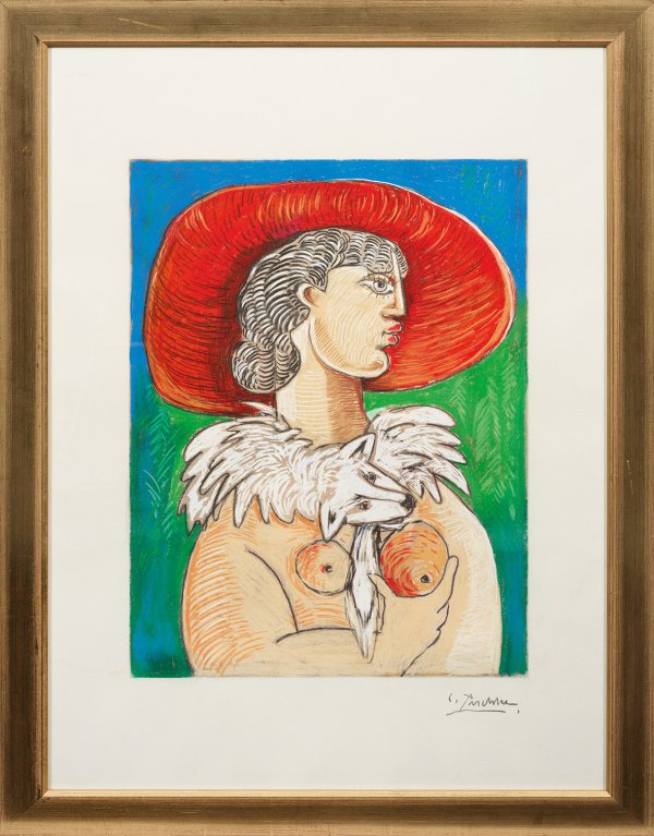 Expressive, wesentlich durch Pablo Picasso beeinflusste Darstellung, wobei die damenhafte Erscheinung des Aktes im Kontrast zur sinnlichen Erotik steht, indem sie mit einer Hand ihre linke Brust wie einen Apfel umfasst. Weibliche Akte sind zentrale Motive im Oeuvre Peschkes, da sie für ihn außer Erotik und Sinnlichkeit auch Vitalität und Schönheit widerspiegeln. Peschke, der bei Gerhard Gollwitzer an der Stuttgarter Akademie lernte, ließ sich mit 35 Jahren als freier Künstler zunächst in Spanien nieder; später wurde er in Meran bzw. Bozen, Bruckmühl und Flintsbach ansässig. Auf zahlreichen Ausstellungen im In- und Ausland war Peschke seit Mitte der 1990er Jahre vertreten. Farbige Öl- oder Wachskreiden/Karton. R. u. sign.; Gesamtmaße 100 cm x 70 cm. Rahmen.