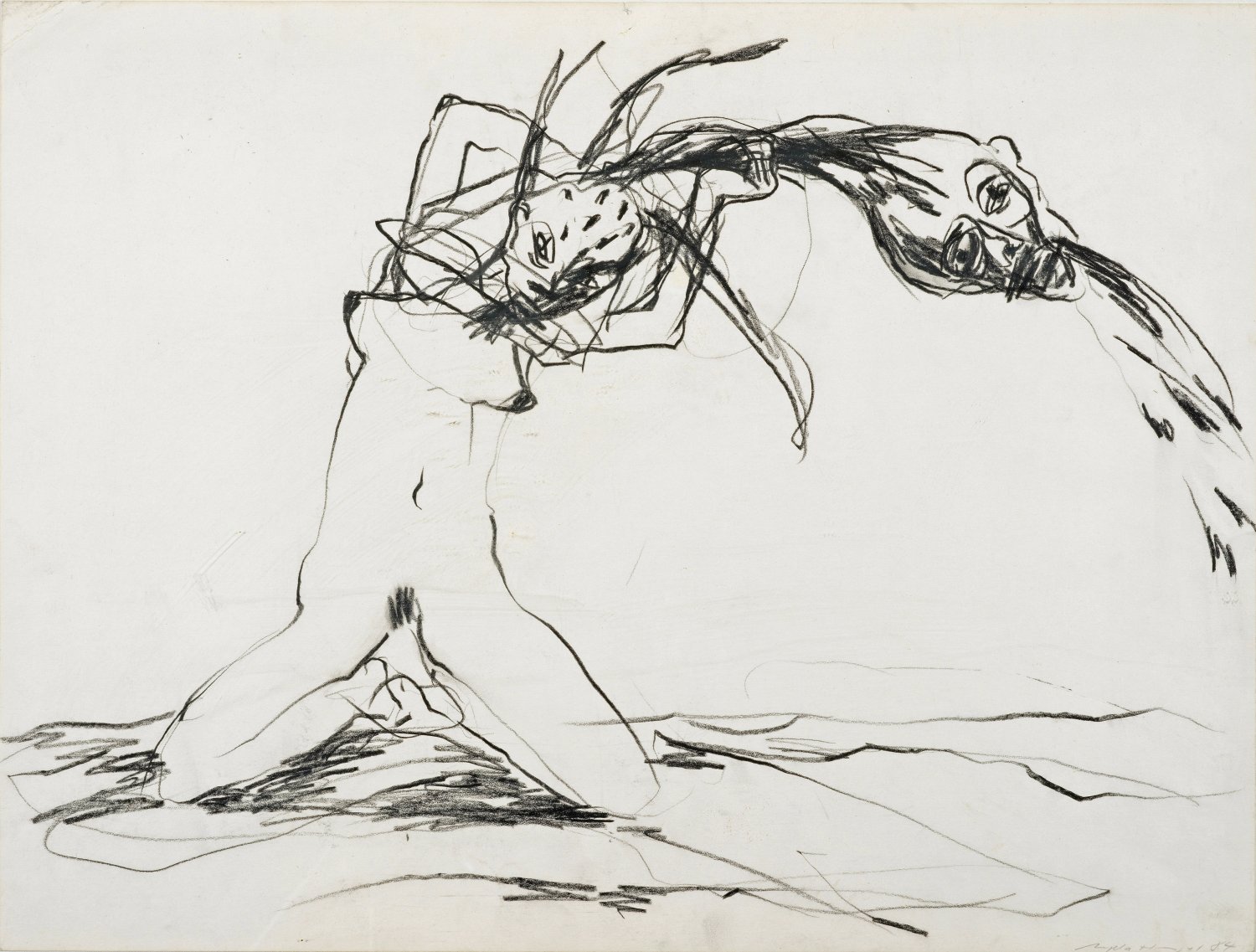 Black chalk on paper. Signed and dated (19)84. Creases.