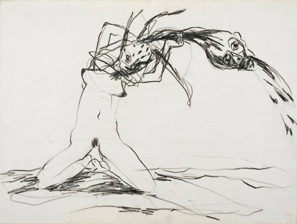 Von dünnen, schwungvollen Linien bestimmtes, die Bewegung fokussierendes Blatt mit der fragmentarischen Darstellung des alttestamentarischen Themas, allerdings in einer impulsiv-aggressiven Neuinterpretation durch die Dresdner Künstlerin Angela Hampel. Nach dem Abendstudium an der Außenstelle der Hochschule für Bildende Künste Dresden (HfBK) in Bautzen studierte sie von 1977 bis 1982 in Dresden an der HfBK Malerei bei Jutta Damme und Dietmar Büttner. Anschließend arbeitete sie als freischaffende Künstlerin in Dresden. Kohlezeichnung/Papier. Knickfalten. R. u. sign. und dat. (19)84. Blattgröße 43,5 cm x 57,5 cm. Rahmen