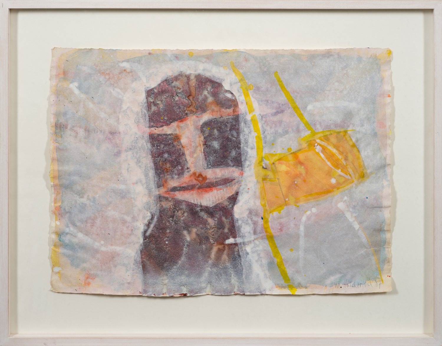 Figuratives, maskenhaftes Blatt Holderieds, der ab 1965 an der Münchner Akademie studierte und 1971 als Meisterschüler bei Josef Oberberger abschloss. Zunächst zweideimensional tätig, arbeitete der Künstler bald in der dreidimensionalen Ebene mit Objektkästen, in denen er Alltagsgegenstände zu zivilisationskritischen Ikonen stilisierte. Später konzentrierte er sich vermehrt auf Skulpturen- und Land-Art-Projekte, wobei er besonders durch sein für den neuen Münchner Flughafen geschaffenes Erdzeichen "Eine Insel für die Zeit" bekannt wurde. Mischtechnik mit Gouache/festes, handgschöpftes Büttenpapier. R. u. sign. und dat. (19)87. Verso Etikett der Kunsthandlung Alexander Schott, München. 41 cm x 55 cm. Rahmen.
