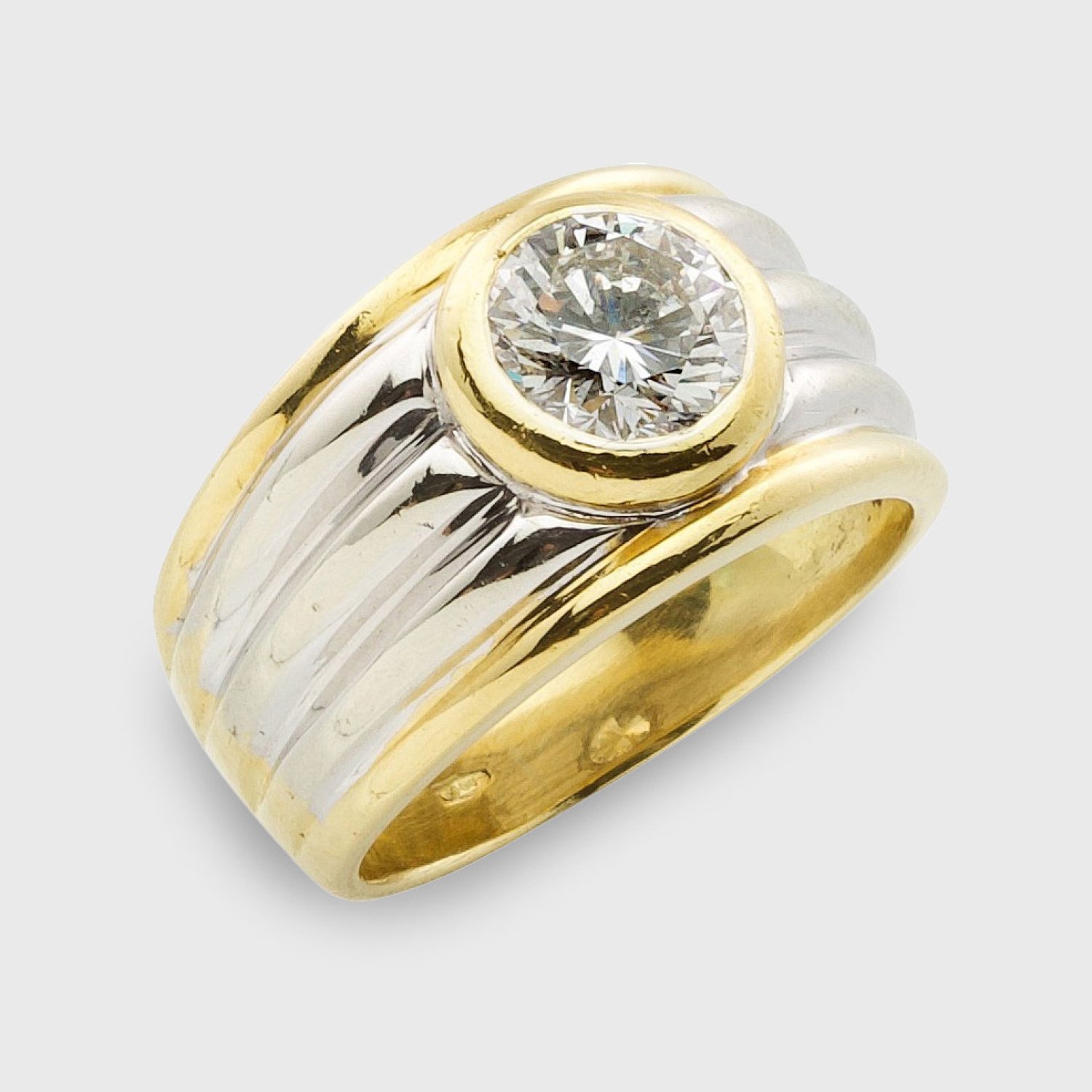Gelb- und Weißgold, gest. 750. Zentral besetzt mit einem Brillanten von ca. 1,00 ct. (I-J/vs) im Übergangschliff. Gew. ca. 8,38 g.