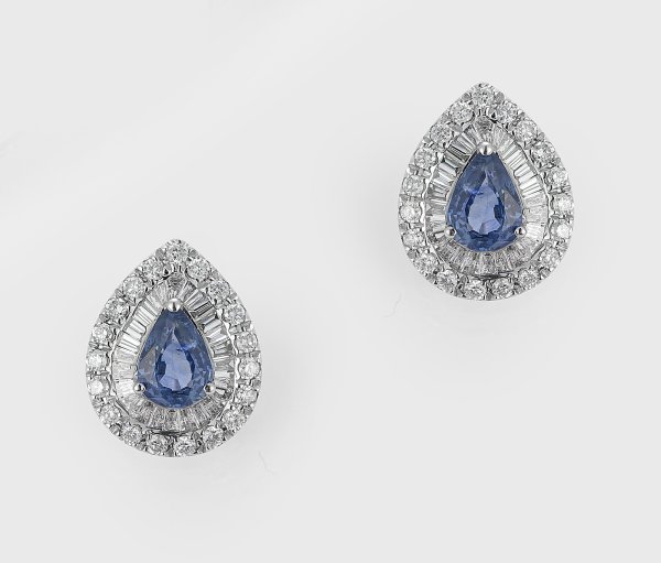 Pair of earrings set with sapphires approx. 1,20 ct. and diamonds approx. 0,95 ct. (G-H/si), in 18 k white gold.