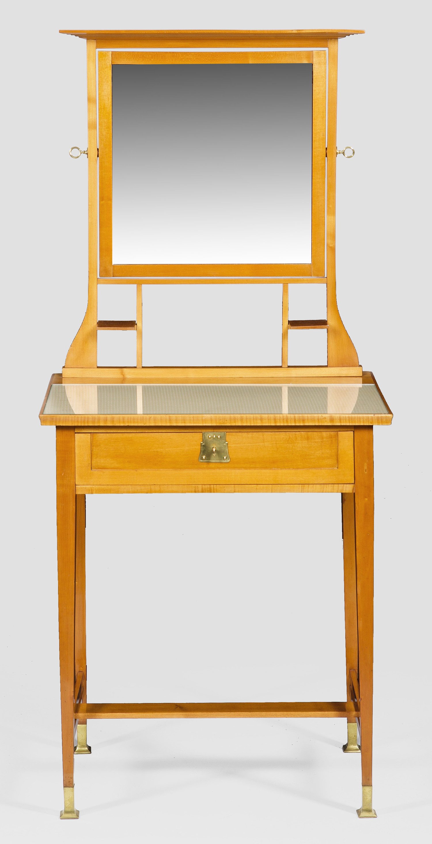 Ahorn, massiv und furniert. Gerader, einschübiger Zargenkasten auf hohen, konischen Vierkantbeinen mit Messingkappen, unterhalb durch schmale, gekantete Stege verbunden. Gering überstehende Deckplatte mit eingelegter Glasfläche. Weit zurückgesetzter, korrespondierender Aufsatz mit schwenkbarer Spiegelfläche sowie kleinen Abstellflächen. Schlüssel mit Herstellerzeichen. H. 147 cm. 65 cm x 46 cm.