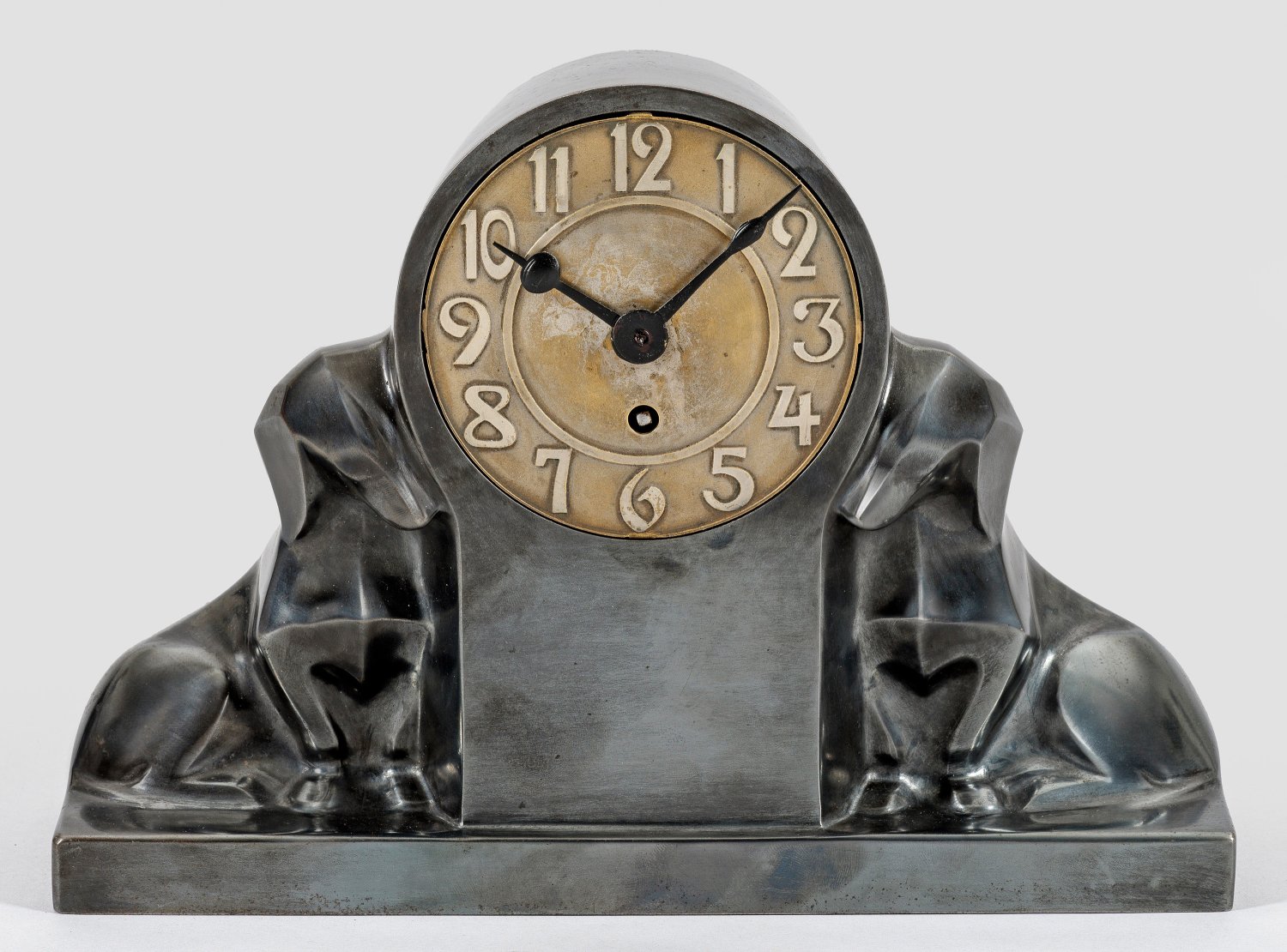 Eisen, gegossen und poliert. Über rechteckiger Plinthe gerundetes Uhrengehäuse, flankiert von sich anschmiegenden Dackeln. Zifferblatt mit erhaben reliefierten Zahlen. Unbez.; Entw. Albin Müller, um 1905 für die III. Deutsche Kunstgewerbeausstellung 1906 in Dresden. H. 21,5 cm.
