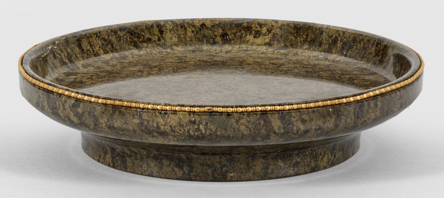 Grüngemaserter Serpentin und Messing. Flachgemuldete Schale, umlaufend mit schmalem Fries aus Eierstab. Teilw. rest.; H. 5,5 cm. D. 26 cm.