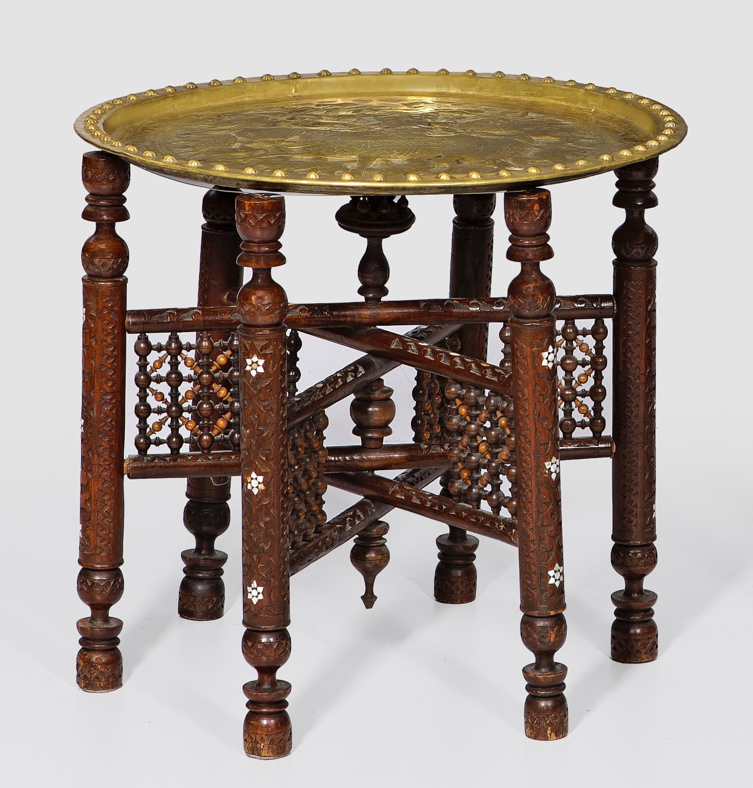 Hartholz, geschnitzt und dunkel gebeizt sowie Einlagen aus Perlmutt. Gestell aus mehrfach gegliederten Balusterstäben, durch kreuzförmig angelegte Streben verbunden. Abnehmbares, figural gestaltetes Messingtablett als Deckplatte. H. 54 cn. D. 59 cm.