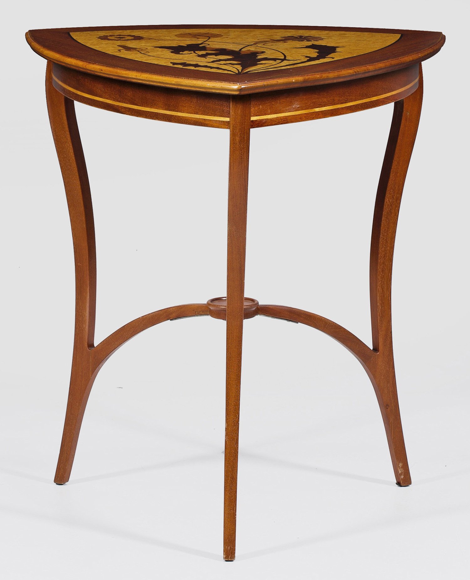 Mahagoni, massiv und furniert sowie Einlagen aus Vogelaugenahorn, Palisander und unterschiedlichen Edelhölzern. Bombierte Zarge auf geschweiften, konisch verlaufenden Vierkantbeinen. Korrespondierende, gerundete Deckplatte mit großflächig angelegter Intarsie aus Löwenzahn. H. 68 cm. 62 cm x 62 cm.