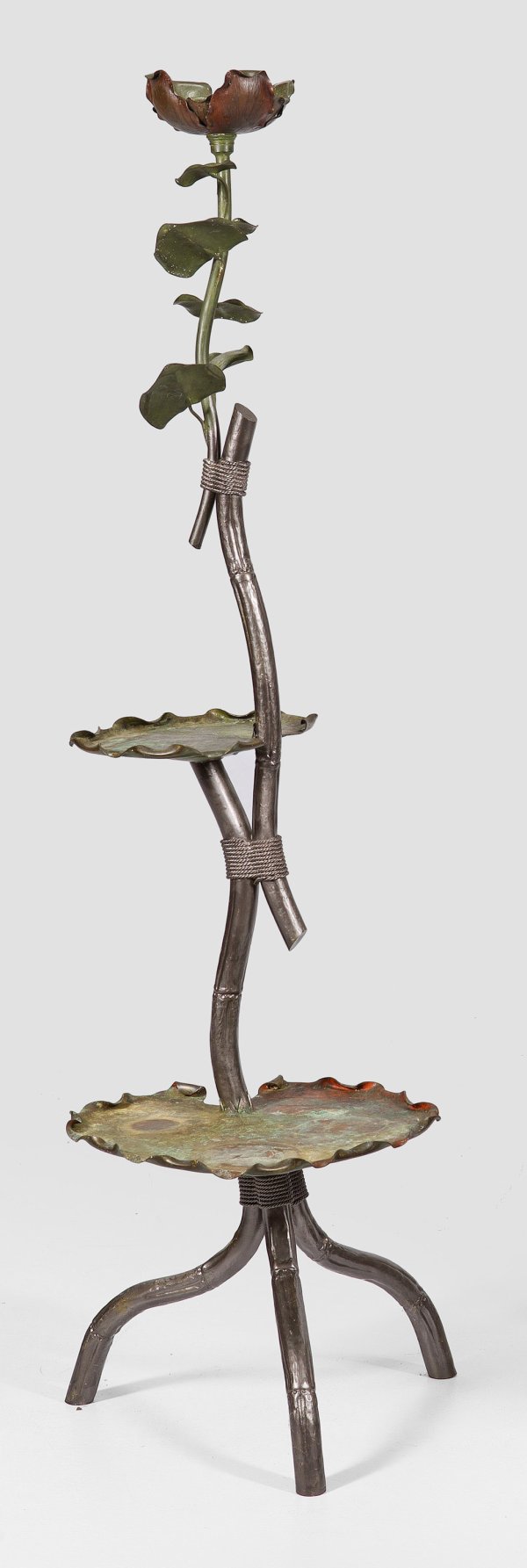 Bronze, patiniert und teilw. grau lackiert. Stark geschwungene, gegeneinander gestellte Streben, durch stilisiertes Kordelband verbunden. Gestaffelt angeordnete Ablageflächen aus Seerosenblättern sowie blütenförmiger oberer Abschluss. H. 172 cm.