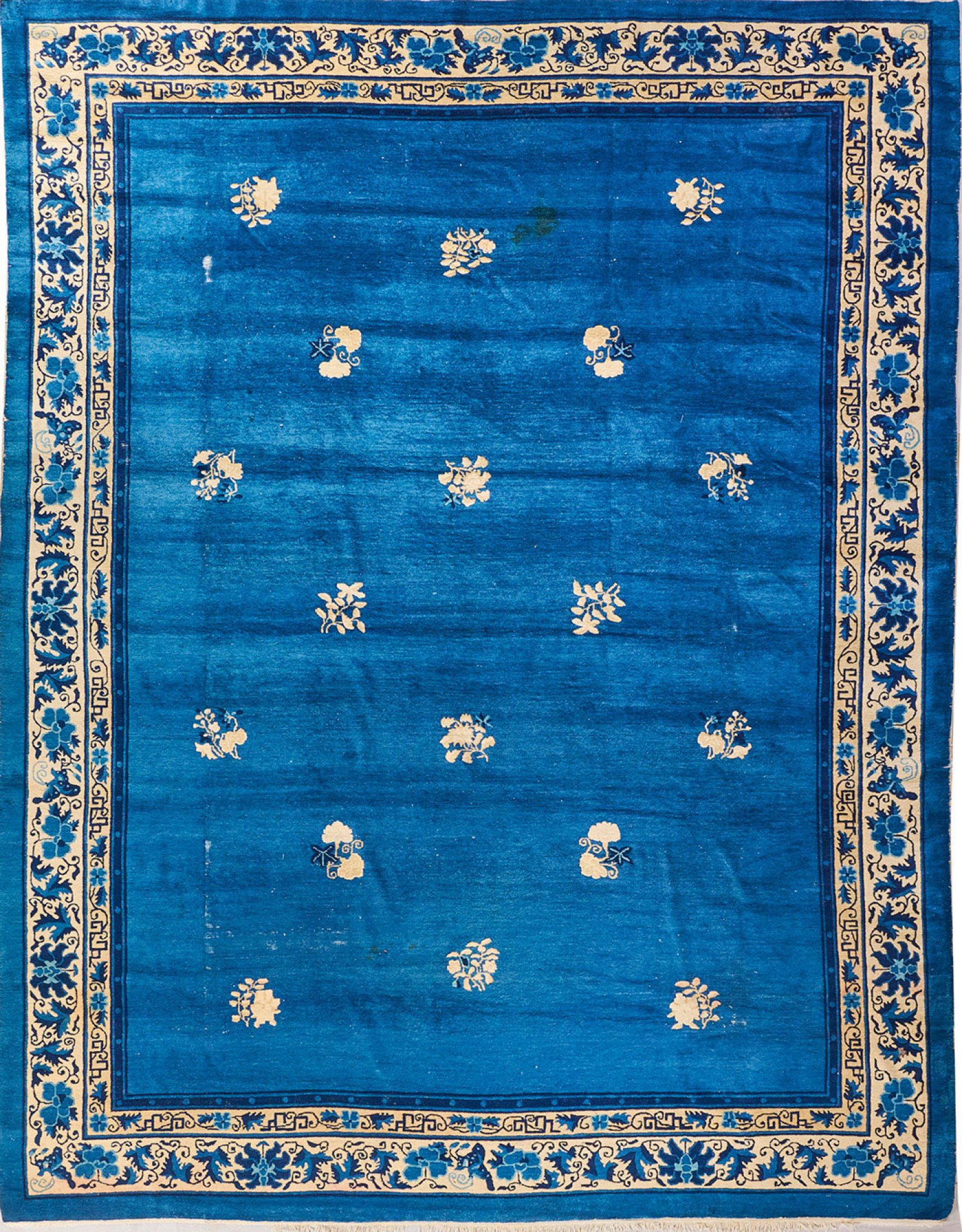 China. Mitte 20. Jh.; Wolle auf Baumwolle. Im blauen, monochromen Innenfeld flächendeckende Musterung aus lose gestreuten Blüten. Umlaufend cremefarbene Hauptbordüre aus dichten Blattranken. 273 cm x 350 cm.