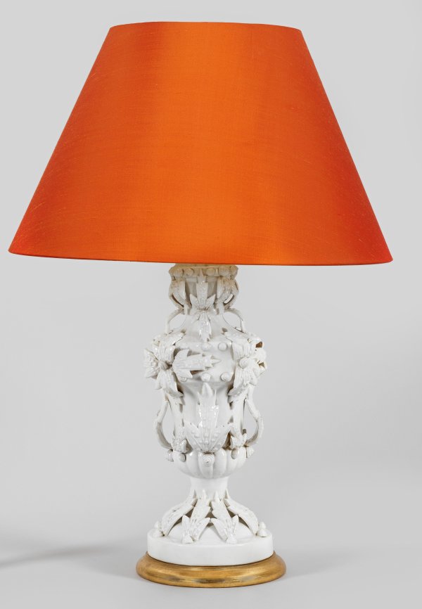 1-flg.; Keramik, altweiß glasiert und Holz, vergoldet. Über flachem Rundsockel mehrfach gegliederter, balusterförmiger Korpus, flächendeckend belegt mit Blattwerk und kleinen, stilisierten Schneckenhäusern. Oberhalb schlanker Schaft als Träger für Leuchtmittel und konischen Lampenschirm. Herstellerzeichen. Elektrifiziert. 86 cm.