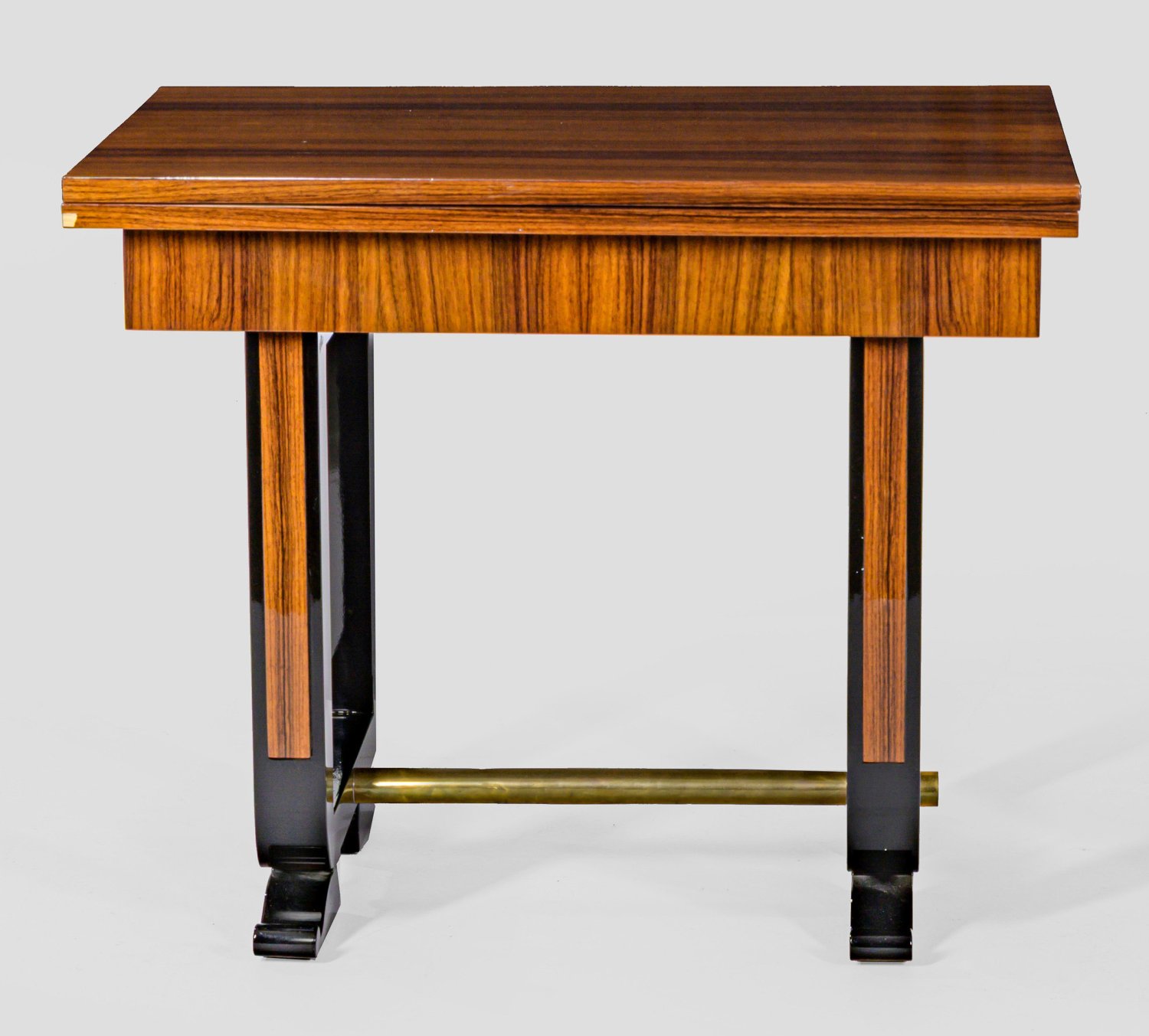 Palisander furniert, Schwarzlack und Messing. Über flachen Volutenfüßen gekantete Streben als Träger für rechteckigen Zargenkasten, unterhalb durch Rundstab verbunden. Rechteckige, aufklappbare Deckplatte. H. 75 cm. 90 cm x 60/120 cm.