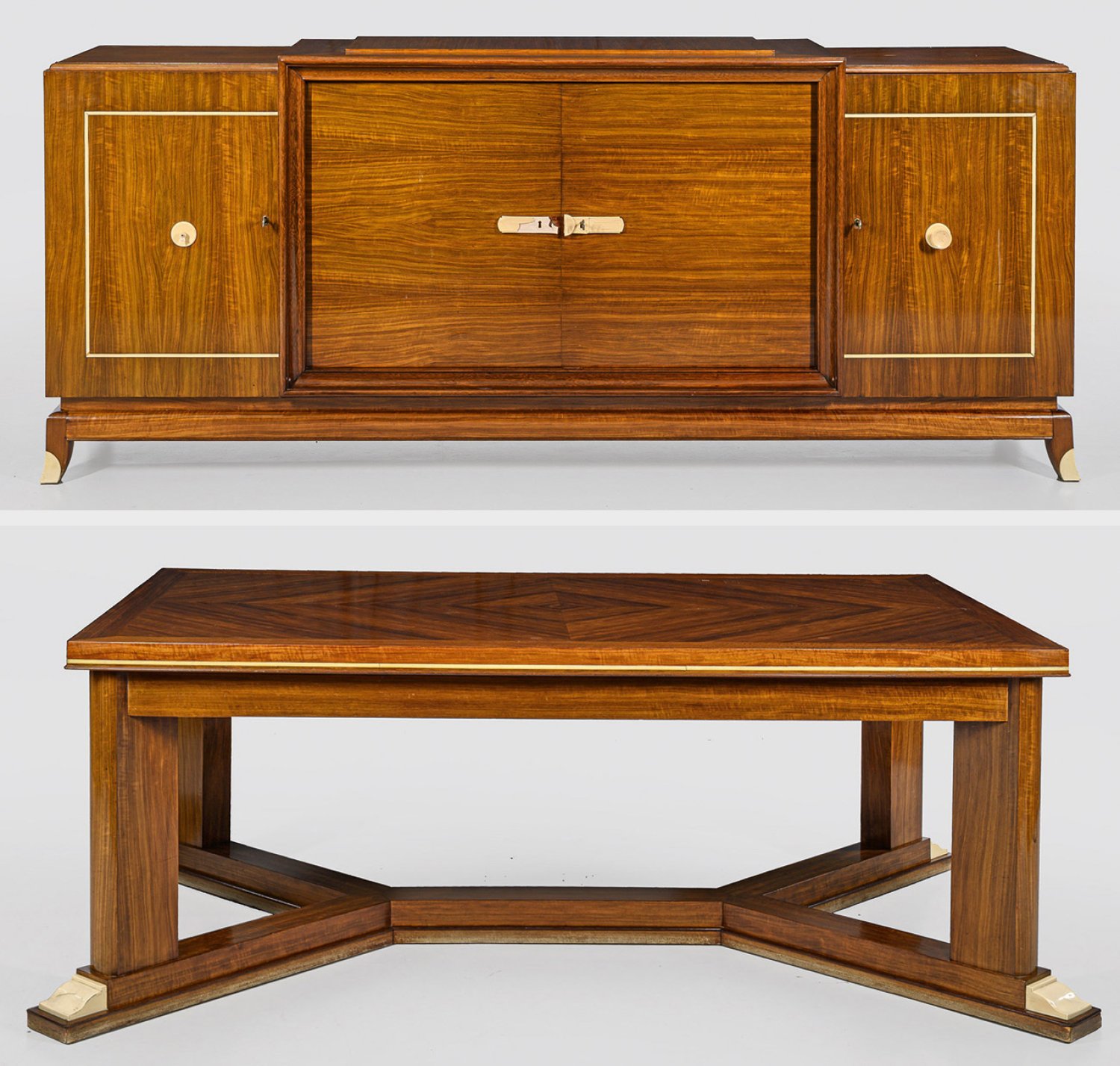 10-tlg.; Sideboard. Esstisch und acht Armlehnstühle. Rosenholz und Palisander, furniert sowie Einlagen und Applikationen aus cremefarbenem Bakelit. Querrechteckig angelegter Korpus auf leicht zurückgesetzter, gerundeter Zarge und geschweiften Füßen. In der gegliederten Front vier Türen unterschiedlicher Größe. Gestuft ansteigender oberer Abschluss. H. 101 cm. 245 cm x 54,5 cm; Gerade Zarge aus schräggestellten, gekanteten Beinen, unterhalb durch breite Stege verbunden; Bakelit teilw. besch.; H. 78 cm. 200 cm x 120 cm; Korrespondierende Armlehnstühle mit ausgestellten Beinen, schmalen Armlehnen und gewölbter Rückenlehne. Gepolstert und bezogen. Sitz-H. 48 cm.