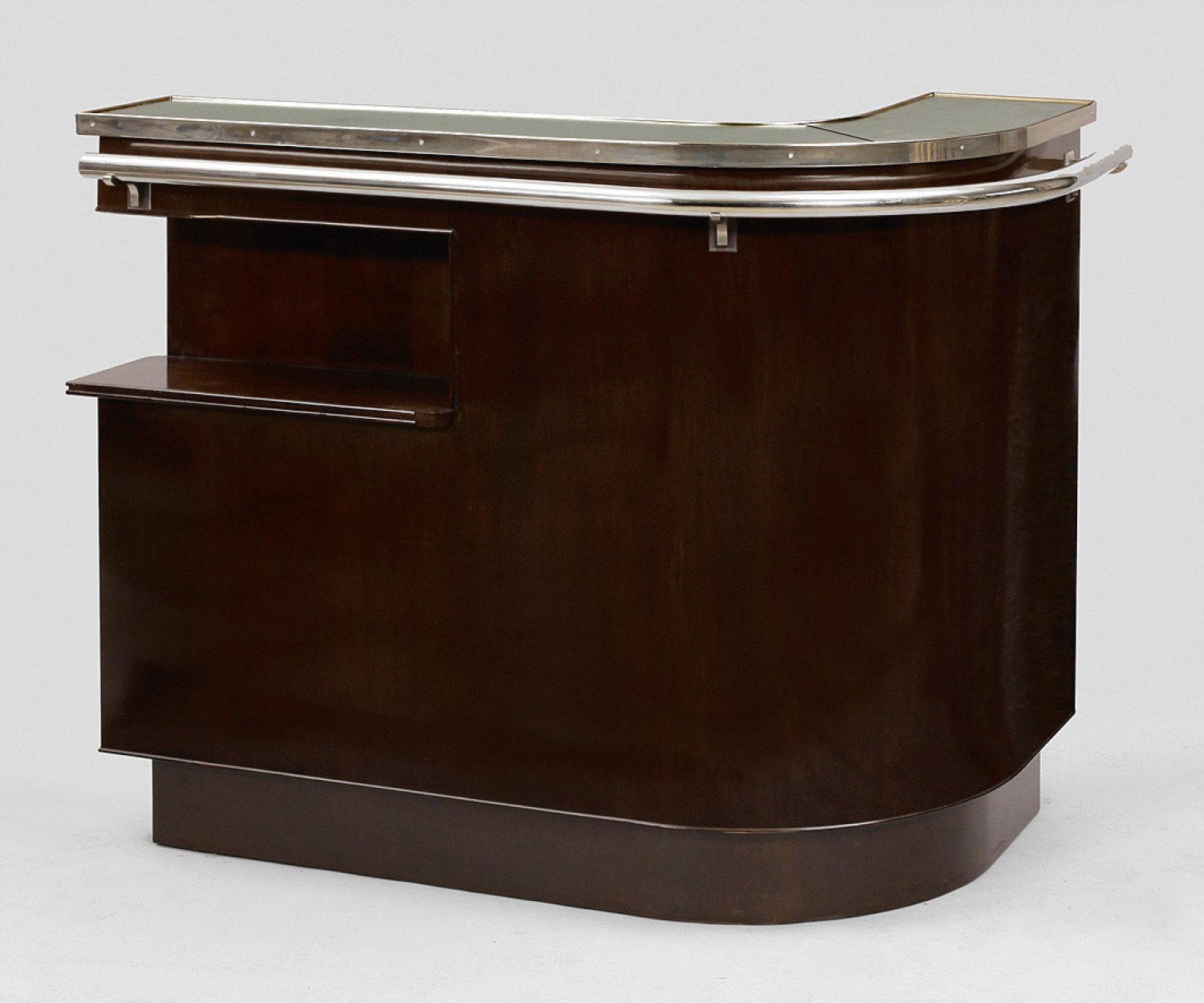 Mahagoni und polierter Chrom. Gerader, zur linken Seite hin abschweifender Korpus. Leicht überstehende, dem Korpus entsprechend profilgerahmte Deckplatte mit eingelassenem Spiegelglas. Unterhalb umlaufender Haltegriff. In der Front ausgespartes Ablagefach. Rückseitig Regaleinteilung und verschließbare Schublade. H. 116 cm. 140 cm x 88 cm.