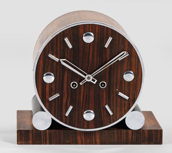 Palisander und Eichenholz, furniert sowie Metall, verchromt. Über rechteckiger Basis rundes Uhrengehäuse mit Indexen. Werk mit Pendelfeder sowie Halbstundenschlag auf Tonfeder. Rücks. Plakette W. Hemink Horloger Winterswijk. H. 25,5 cm. 29,5 cm x 14,5 cm.