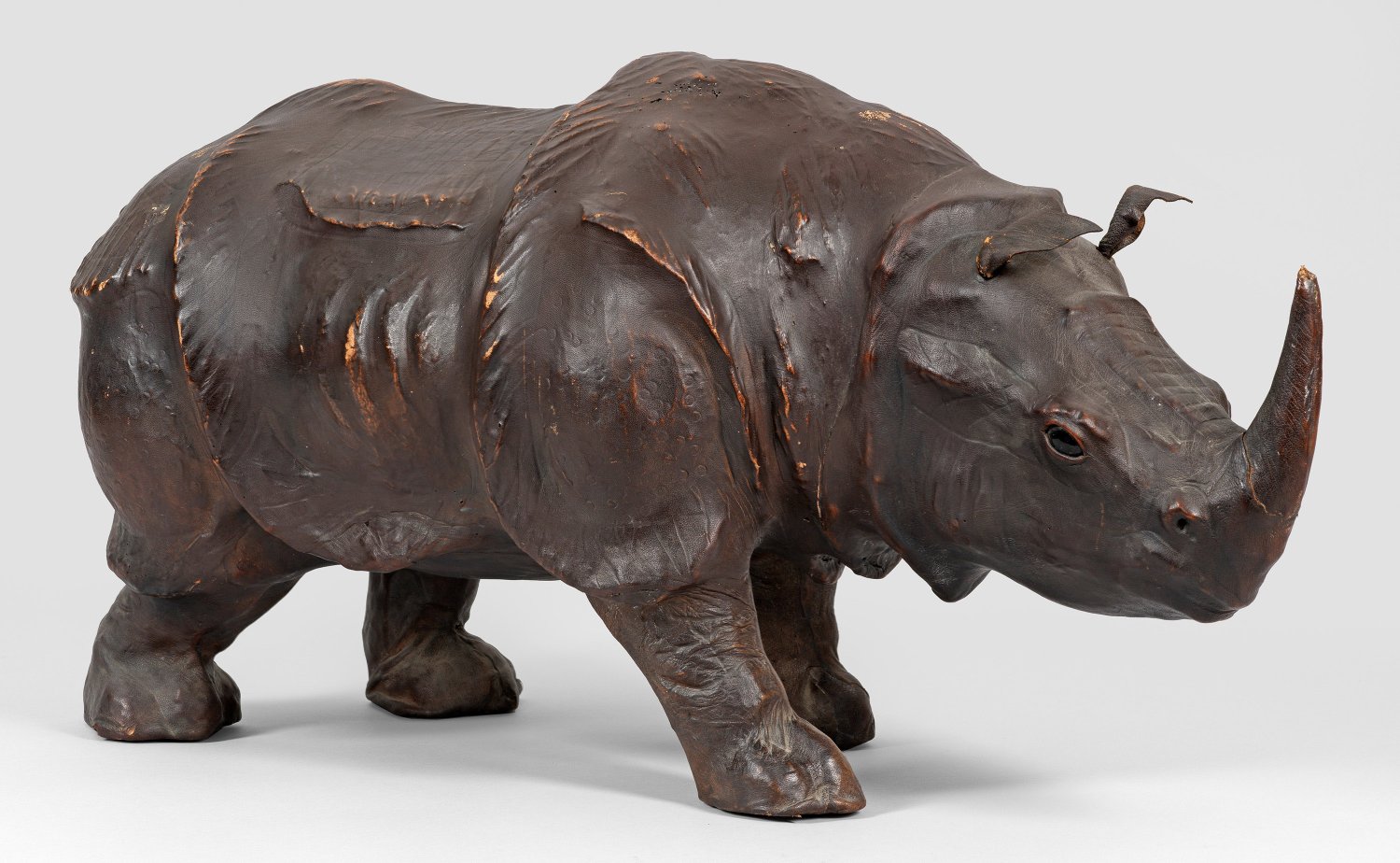 Dunkelbraunes Leder. Vollplastische, naturalistische Ausführung eines Nashorns mit Augen aus Glas. Der Stil erinnert stark an die Ledertiere von Dimitri Omersa für Liberty's London (1930er Jahre). Unbez.; Gebrauchsspuren. Teilw. rest.; H. ca. 45 cm. L. ca. 90 cm.