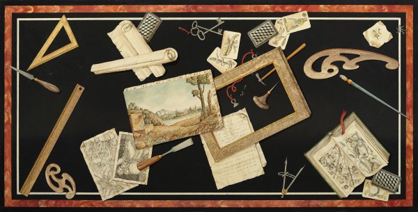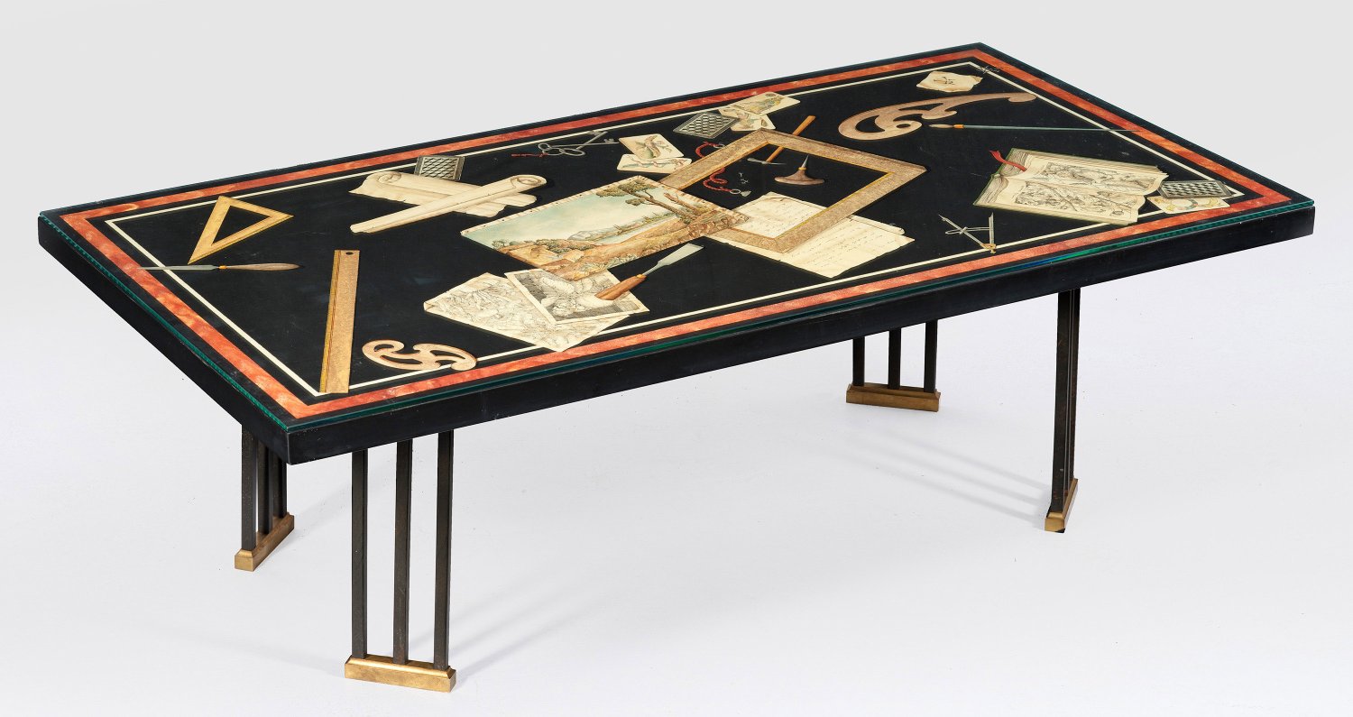 Eisen und Messing sowie sog. Scagliola-Stuckmarmor. Gestell aus in Gruppen angeordneten, stark geschwungenen und teilw. verschlungenen Streben als Träger für rechteckige Deckplatte. Auf schwarzem Fond flächendeckende Tromp d‘ Oeil-Darstellung aus unterschiedlichen Schriftstücken, Werkzeugen, Spielkarten und Schriftrollen, begrenzt von schmalen Bändern. H. 48 cm. 140 cm x 70 cm.