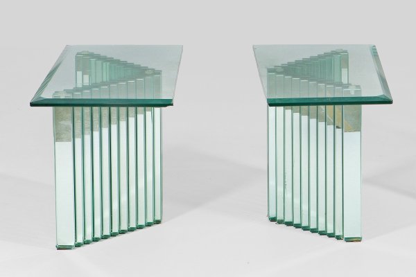 Zweigeteilter Beistelltisch. Spiegelglas und farbloses Glas. Pfeilartig angelegte Stützen aus gestaffelt angeordneten, kräftigen Spiegelelementen als Träger für rechteckige, teilw. facettierte Deckplatte. Entw. Luigi Massoni, 1980er Jahre. H. 37 cm. 60 cm x 30 cm.