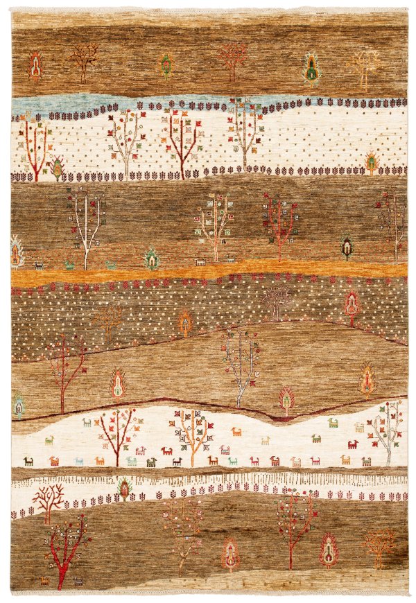 Afghanistan. Wolle auf Baumwolle. Flächendeckende Streifenmusterung aus stilisierten Landschaftsmotiven in unterschiedlichen, dekorativ abraschierten Braun-, Beige- und Orangetönen. 296 cm x 201 cm.