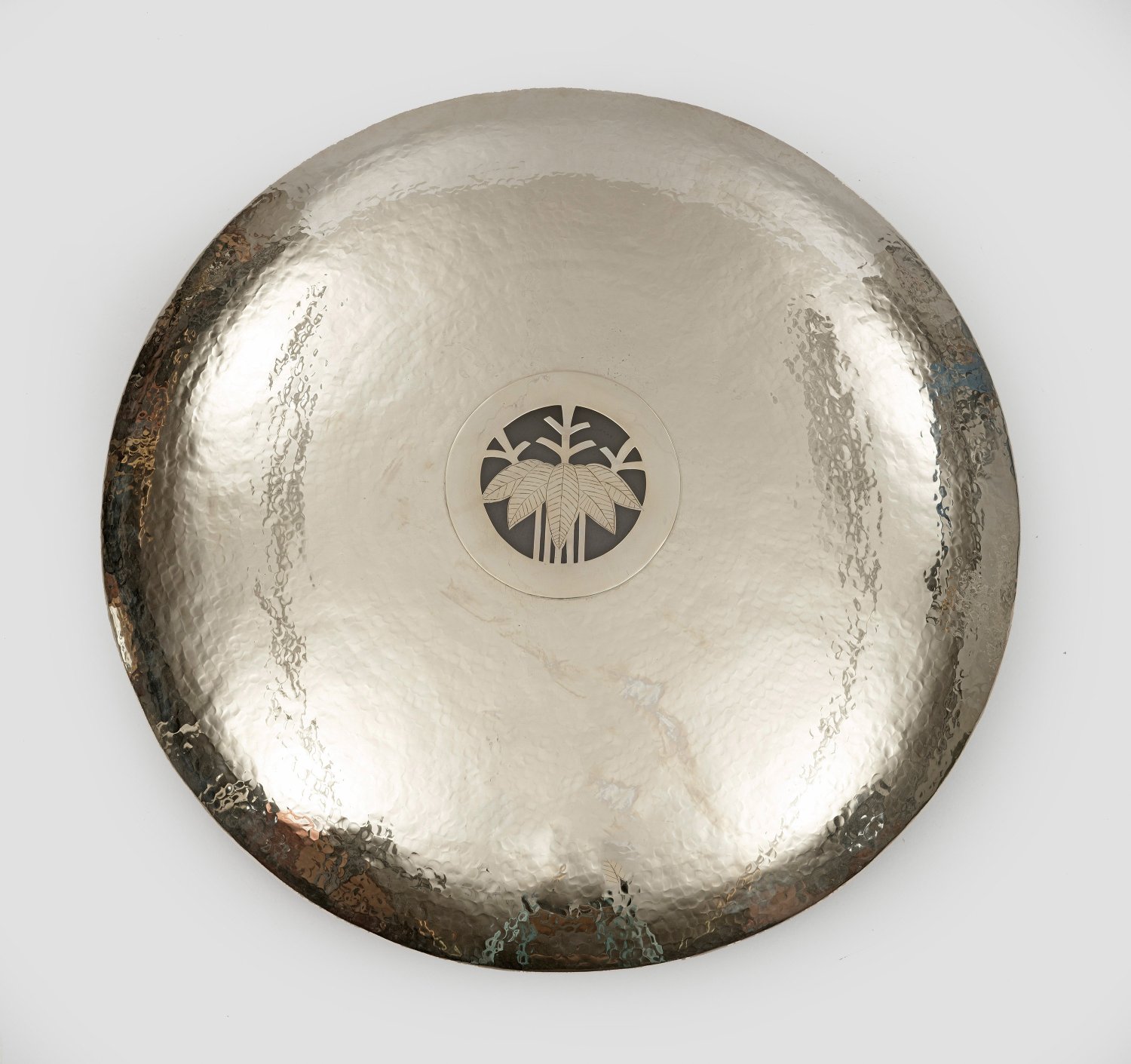 Neusilber. Rundes, flach gewölbtes Wandschild mit flächendeckendem Hammerschlagdekor. In der Mitte floral-ornamental durchbrochen gearbeitetes Tondo. Rückseitig vier Lampenfassungen, elektrifiziert. D. 74 cm.