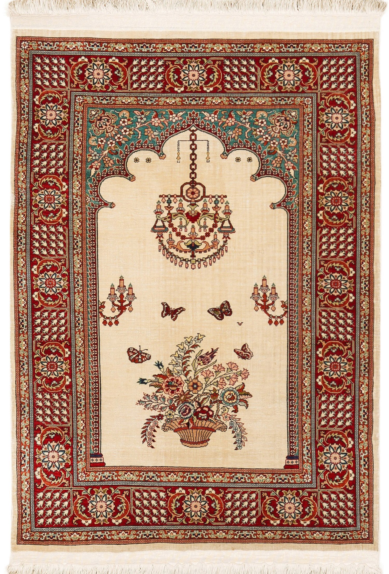 Türkei. Seide auf Seide. Feine Knüpfung. Auf cremefarbenem, monochromem Fond passig geschweifte Nische mit großem Ampelmotiv und mit Blüten gefülltem Korb mit Schmetterlingen. Umlaufend breite, rotgrundige Bordüre mit Rosetten, begrenzt von schmalen Bändern. 92 cm x 63 cm.
