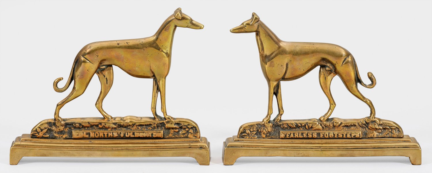 Messing. Zwei schauseitig reliefierte nach links bzw. rechts blickende Greyhounds auf mehrfach profilierten, mit Blüten ornamentierten Sockeln. Inschrift "Col. Norths' Fullerton" bzw. "Fearless Footsteps" nach den Siegerhunden des Waterloo Cups 1889 - 1892 bzw. 1900 - 1901. Leichte Gebrauchsspuren. H. 20,5 cm - 21,5 cm.
