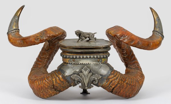 Plated und Widderhorn. Vollständiges Widdergehörn, zentraler Stützfuß in Form eines Fisches, gehalten von Akanthuspalmetten. Versilberte Spitzenaufsätze und zentral montierte, ovale Schnupftabakdose mit bauchigem Korpus, scharniertem Deckel und Deckelknauf in Form eines Hundes. Spitzen mit Blättern graviert. Herstellerzeichen. H. 28 cm. B. 48 cm.