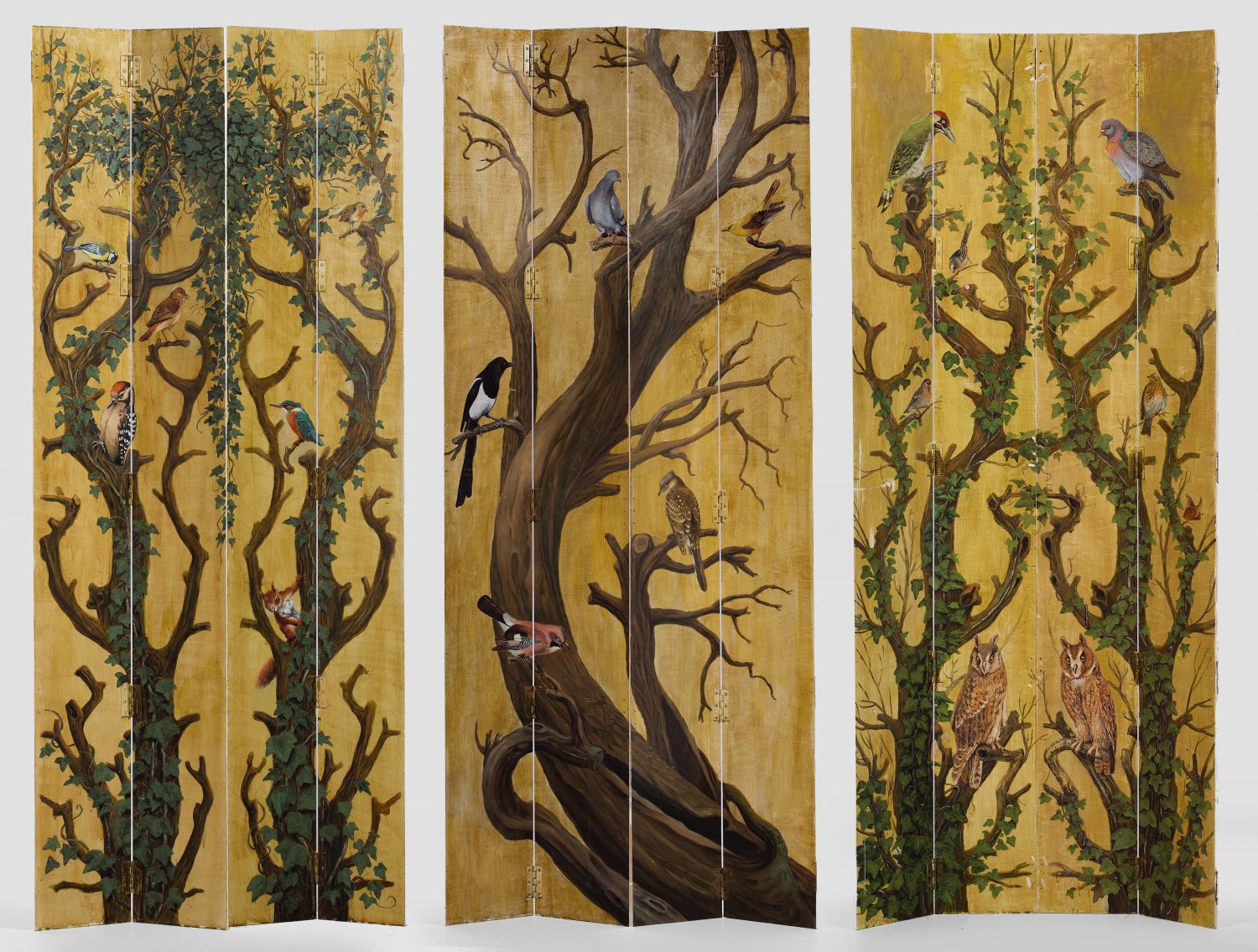 12-tlg.; Holz, farbig bemalt. Schmale hochrechteckige Paneele. Schauseitig auf beigefarbenem Fond flächendeckende Darstellung aus großzügig angelegtem Astwerk und Efeu sowie diversen heimischen Vogelarten, wie Eule, Elster, Specht und Meise. Rückseitig grünes Ornamentmuster auf weißem Fond. Pro Paneel: 180 cm x 21 cm.