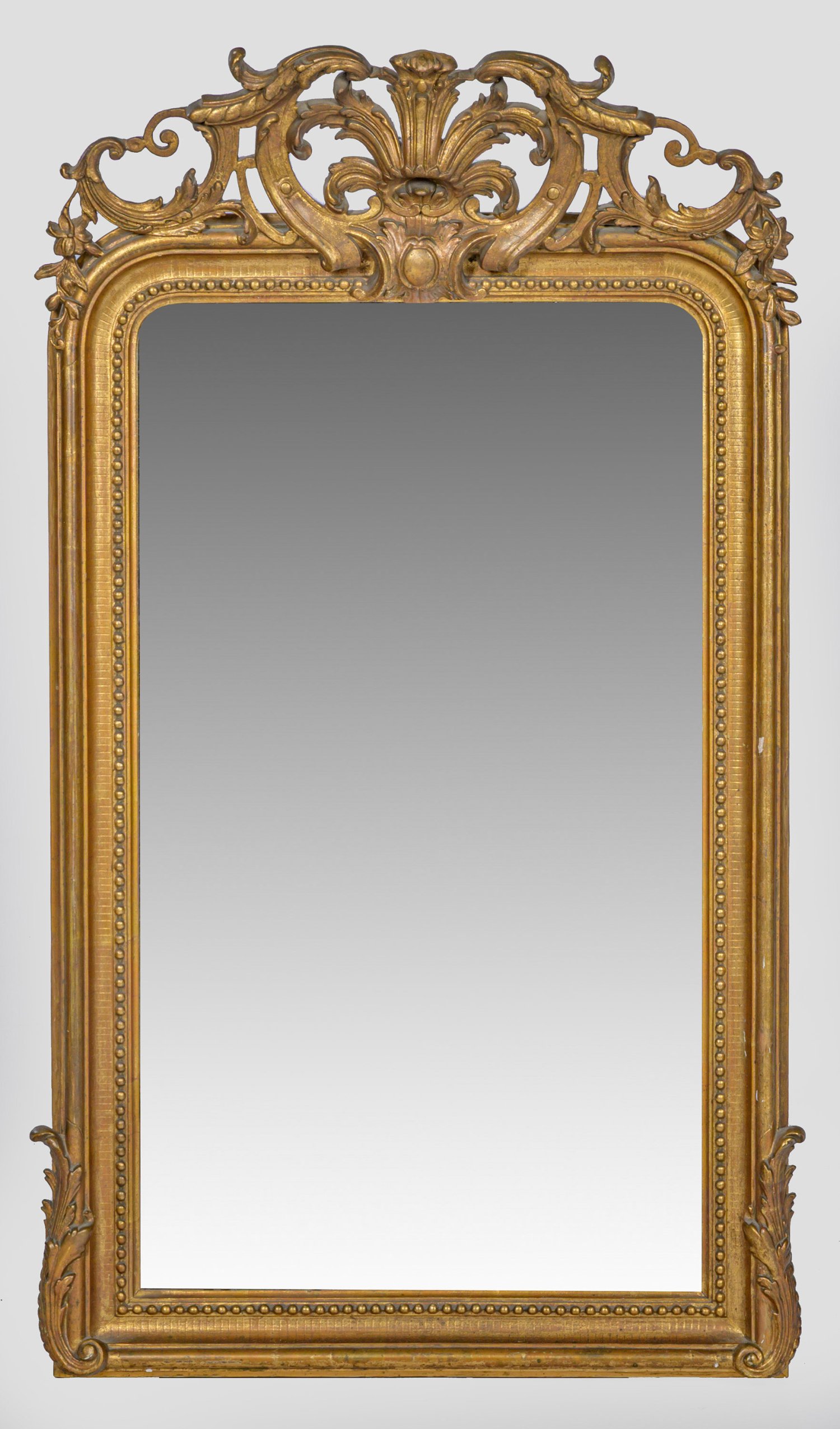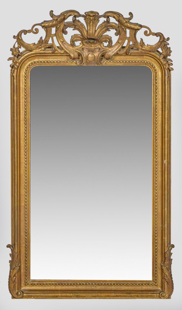 Holz, stuckiert und vergoldet. Gerade, hochrechteckige Spiegelrahmung mit Perlstabfries und gerundetem oberen Abschluss. Stark vorkragende, durchbrochen gearbeitete Bekrönung aus üppigen Blatt- und Volutenmotiven. 116 cm x 66 cm.