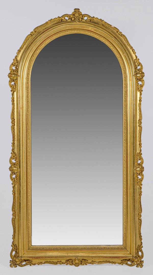 Holz, stuckiert, gefasst und vergoldet. Hochrechteckige, umlaufend profilierte Spiegelrahmung mit Palmettenfries sowie durchbrochen gearbeiteten Voluten- und Kartuschenmotiven. Hochgewölbter oberen Abschluss mit kleiner Maskaronbekrönung. 210 cm x 110 cm.