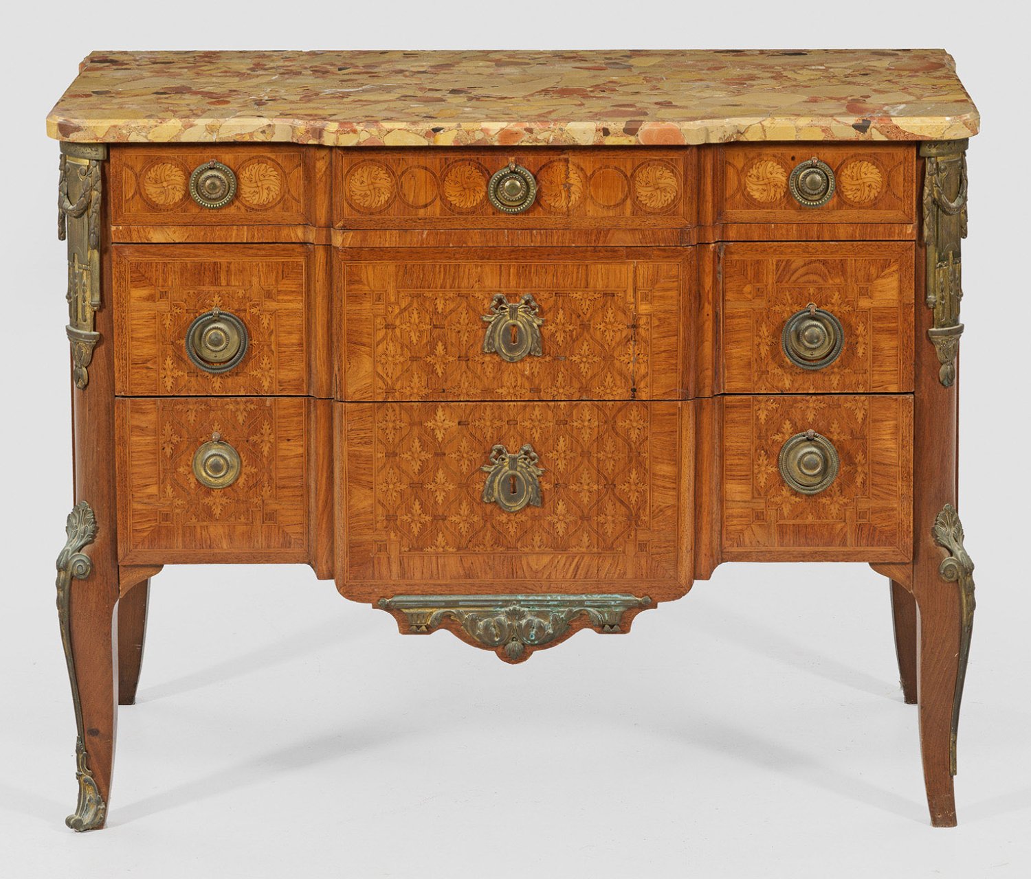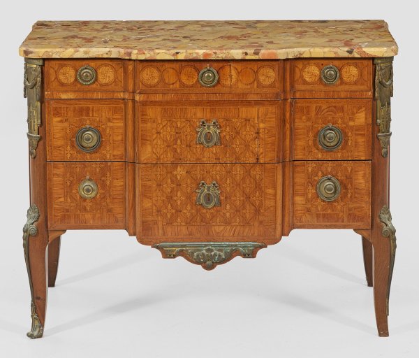 Rosenholz furniert. Querrechteckig angelegter Korpus, flankiert von schräggestellten Ecklisenen, in leicht geschweifte Beine übergehend. In der gegliederten Front drei breite Schubladen unterschiedlicher Größe, durch Mittelrisalit verbunden. Flächendeckende Furnierfelder aus Rautenmarketerie und Blattkartuschen, von schmalen Bandeinlagen begrenzt. Schlagstempel MARCEL DEFORD. Gering überstehende Deckplatte aus beigefarbenem, sog. Breche d'Alep-Marmor. H. 85 cm. 111 cm x 50,5 cm.
