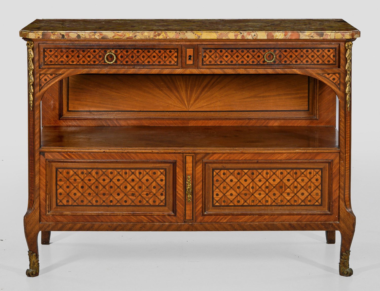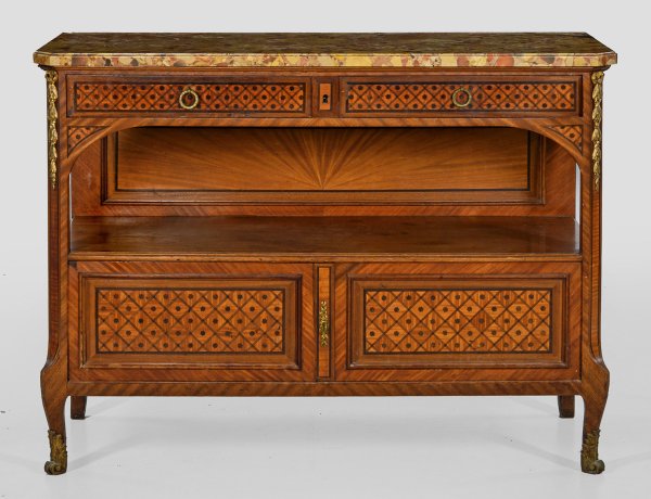 Mahagoni und Rosenholz, furniert. Gerader, querrechteckig angelegter Korpus, flankiert von schräggestellten Ecklisenen, in geschwungene Beine übergehend. In der gegliederten Front zwei Türen sowie breites, offenes Ablagefach. Oberhalb zwei Schubfächer. Flächendeckende Furnierfelder aus Gitterwerk. Gering überstehende Deckplatte aus sog. Breche d'Alep-Marmor. H. 101 cm. 135,5 cm x 52 cm.