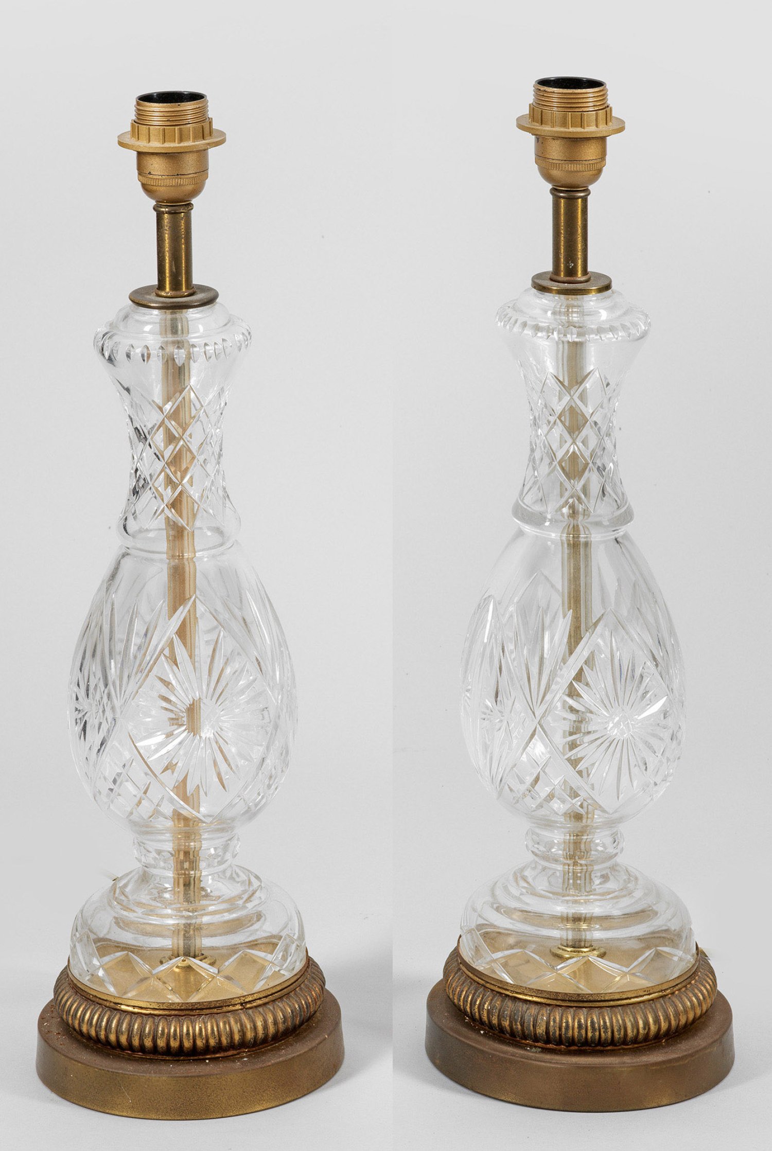 1-flg.; Geschliffenes Kristallglas und Metall. Über flachen Rundsockel mehrfach gegliederter Balusterschaft mit flächendeckendem Facettedekor. Oberhalb kurzer Schaft als Träger für Leuchtmittel. Elektrifiziert. H. 54 cm.