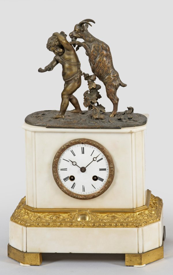 Weißer Marmor und Bronze. Rechteckiges Gehäuse, flankiert von schräggestellten Ecklisenen auf breit profiliertem Sockel. Vollplastische Darstellung eines jungen Bacchanten mit Ziege. Profilgerahmtes Zifferblatt. Pendulenwerk mit Pendelfeder sowie Halbstundenschlag auf Glocke. H. 39 cm. 24 cm x 13 cm.