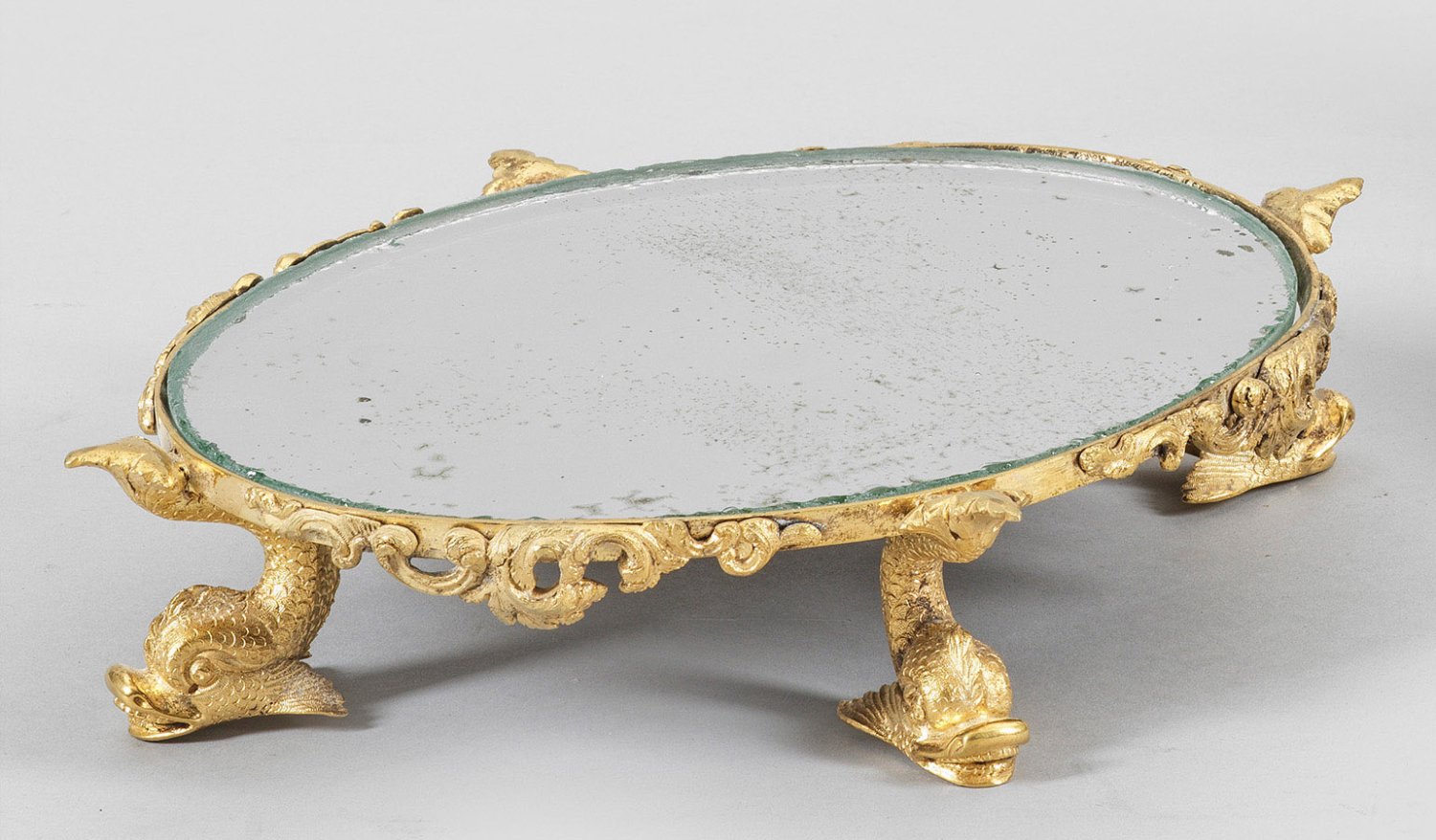 Bronze, vergoldet. Schmale, ovale Rahmung mit applizierten Rocaillen auf vollplastisch gestalteten Delphinen. Eingelegte Spiegelfläche mit Altersspuren. H. 5,5 cm. 25,5 cm x 20,5 cm.