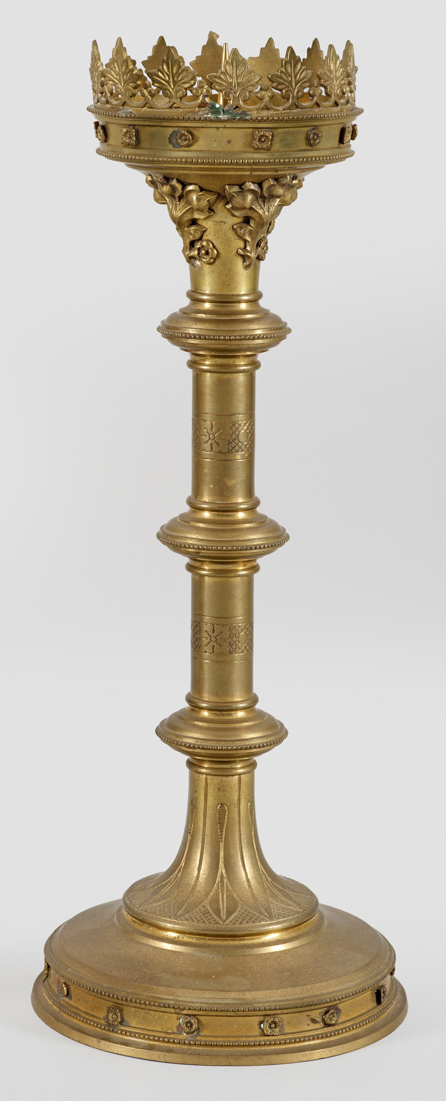 Messing. Über Rundfuß mit zylindrischer, blütenbesetzter Wandung gerahmt von zwei Eierstabfriesen, trompetenfömiger, mit Blütenblattmuster verzierter Schaftansatz und minim. konisch zulaufender Schaft mit Profilwülsten und drei kräftigen, außen spitz zulaufenden, mit Eierstabfriesen umzogenen Nodi. Die Fußgestaltung widerspiegelnde Tropfschale mit Dorn. Minim. Rest.; H. 46 cm.